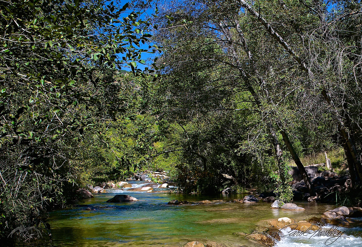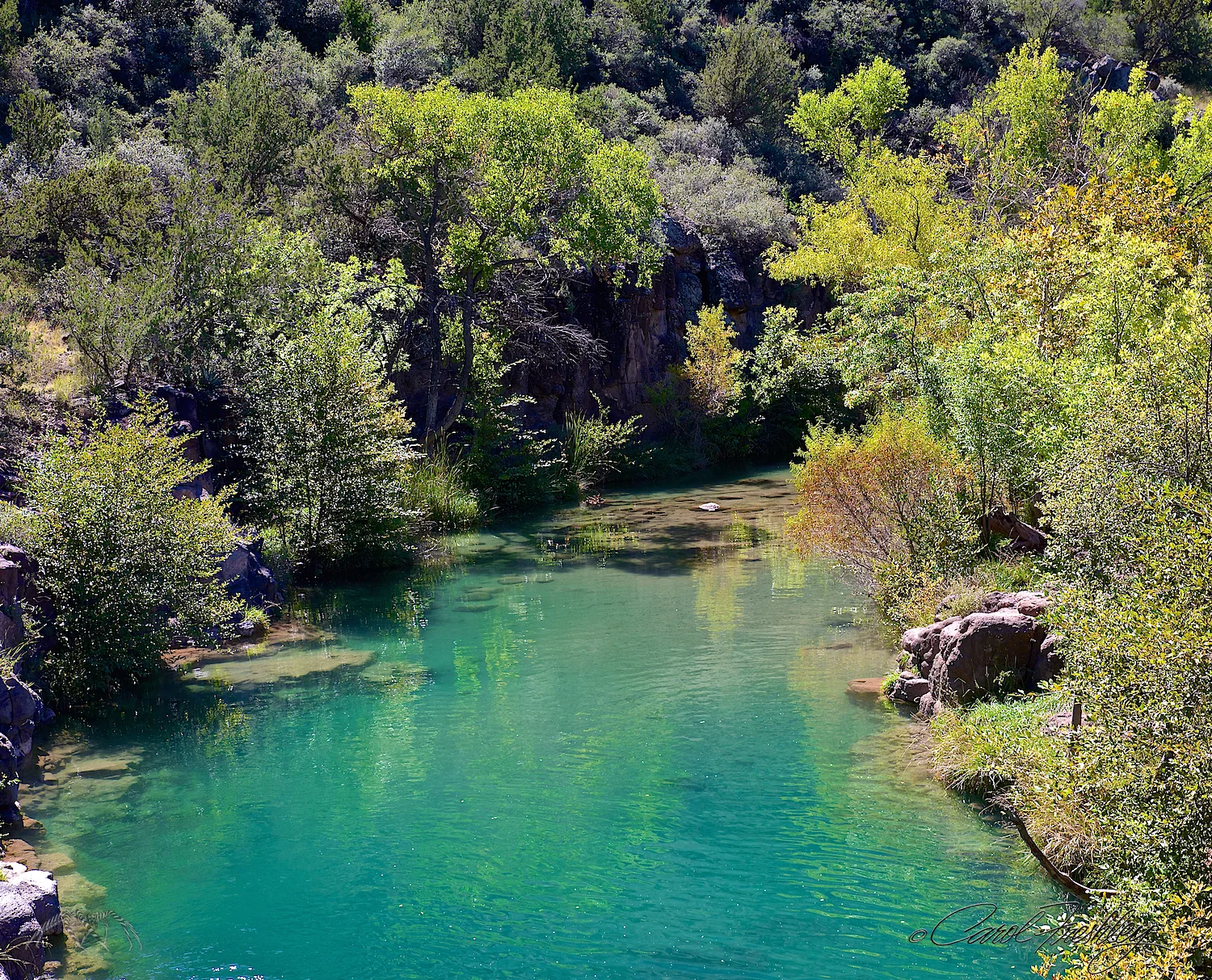 Rick has wanted to photograph the Fossil Creek area for a long time (that being any time more than 30 days to a photographer). This special creek, described by the Coconino National Forest Recreation Site, "Fossil Creek is only one of two National Wildlife and Scenic rivers in AZ." Hmmm . . . wonder where the other one is. When one is next to it, appreciating the rapid flow, it is easy to believe the number of over 30 million gallons of water being put into the creek each day!!! Not only that, but the temperature of the water is reported to be between 70 and 72 degrees year round. The water contains minerals that give it a blue green color, a photographer's delight. The photo above may be my favorite of the photos that I took. It was taken from the bridge, just as you enter the 'best part of all'. After a grueling 15+ mile washboard dirt road, the bridge marked the beginning of what was to be an awesome day!! Worth every foot! Of course, that is easy for me to say as Rick did the hard work of driving us in as much comfort as one could ask for when riding on a washboard. Thank you, Rick. You are awesome!