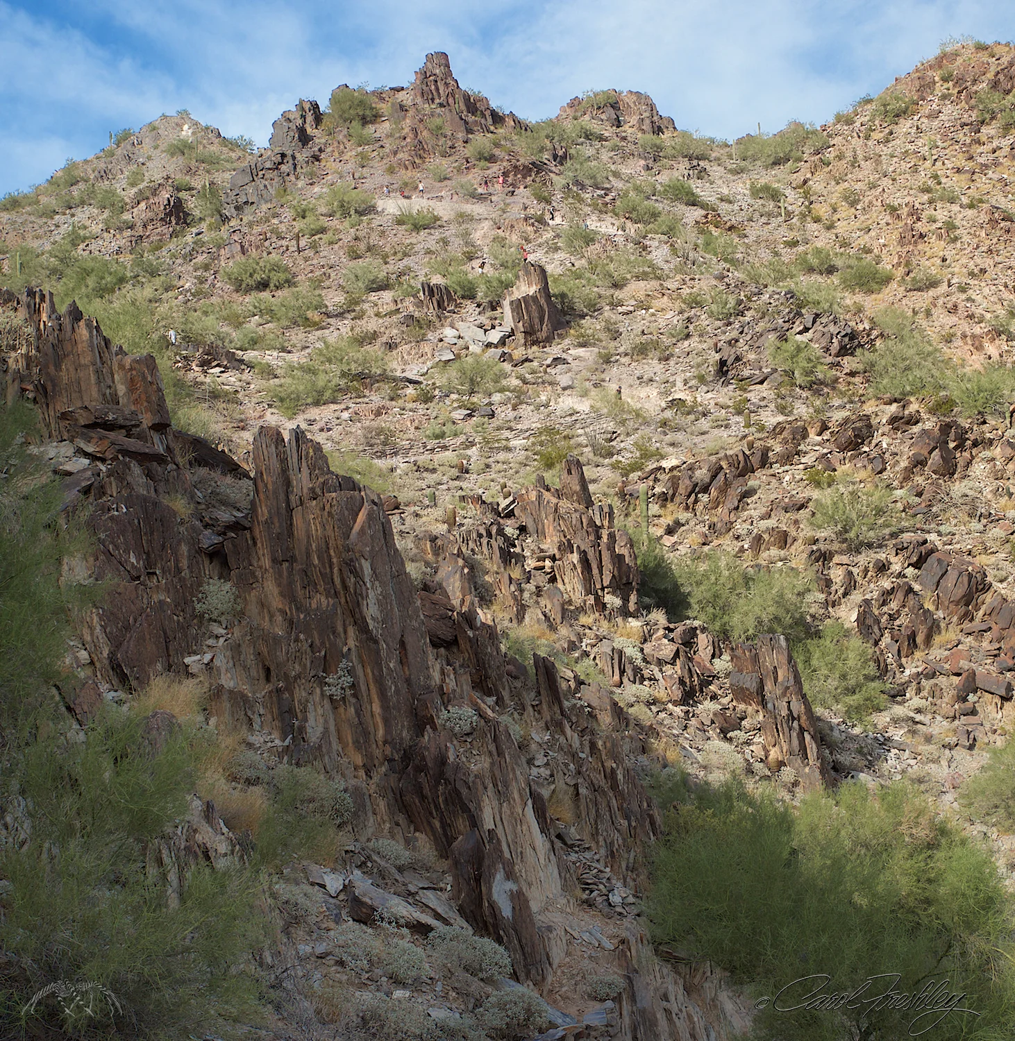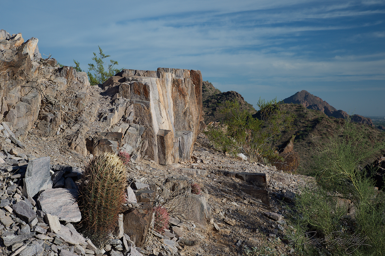 I didn't expect to make it to the top and I didn't. I made it to the 0.75 mile mark on this well known one mile trail to the summit of Piestewa Peak. The trail, while steep and rocky, quickly opens up vistas and photographic opportunities that I suspect change each time the trail is hiked. I went up with my lightest camera, the Nikon Df and two lens. The tradeoff of less weight was the necessity of handholding my camera. Enjoy the shots. One day I will share the image from the top!!