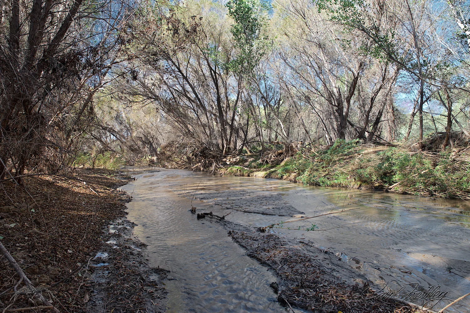 The water is about 4 to 6 inches deep and clear. It comes from a natural spring and periodically goes underground only to resurface further downstream. In heavy storms the river bed will fill up with temporary heavy run-off.