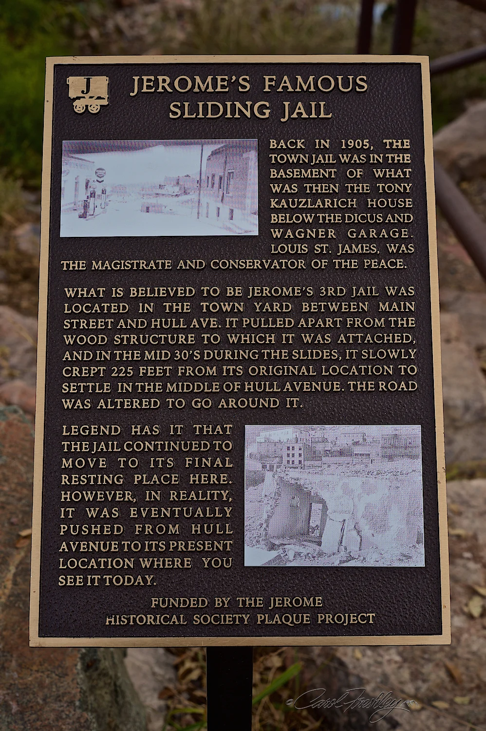 I have heard that this is the old jail and that it is sliding off the hill. Below is the real scoop.