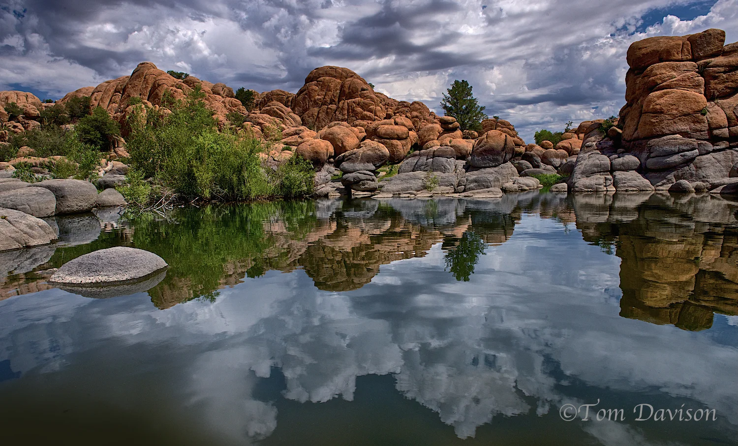 Photographers are drawn to the rocky side of Watson Lake. I think that is because it looks so surreal, especially in unusual lighting and weather. But, to the south of the rocks is a much different look, almost pastoral and peaceful. On the far end of the lake is an area for hiking in a developing riparian. It even features a red wooden bridge! So, if you ever get tired of the rocks, take a hike among the cottonwoods. Oh, and we noticed, long before reaching the lake, that the whole area was really green. All that summer rain is making for some good photography.