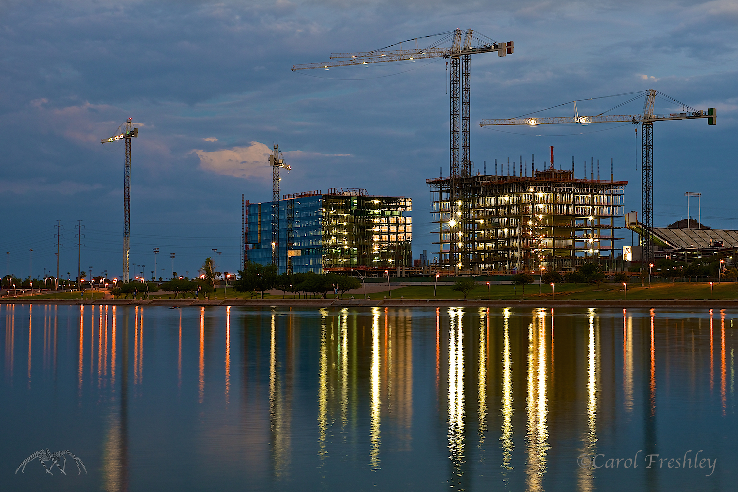 Unfortunately, I think I am an opportunist when it comes to photography. I go and see what I can find and come home. I seldom go in search of a specific image. That is too bad. But, I had been eyeing an opportunity for some time and had created just the perfect image in my mind. It was of the building just south of Tempe Lake between the Mill Avenue bridge and Rural Road. There were at least 5 cranes, partial buildings, and I thought it would make a great photo in a blue hour. And then . . . Super Moon!!!!