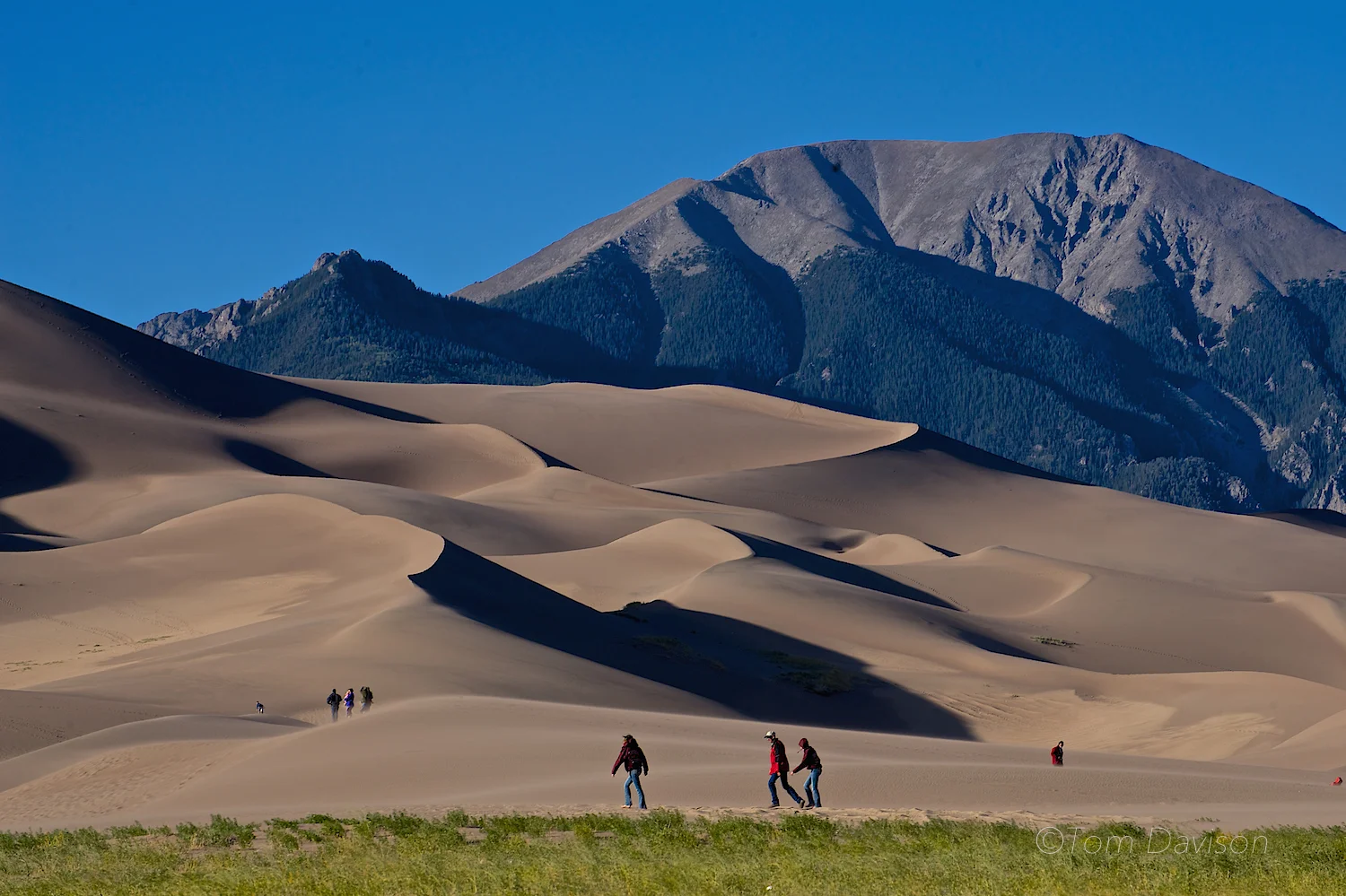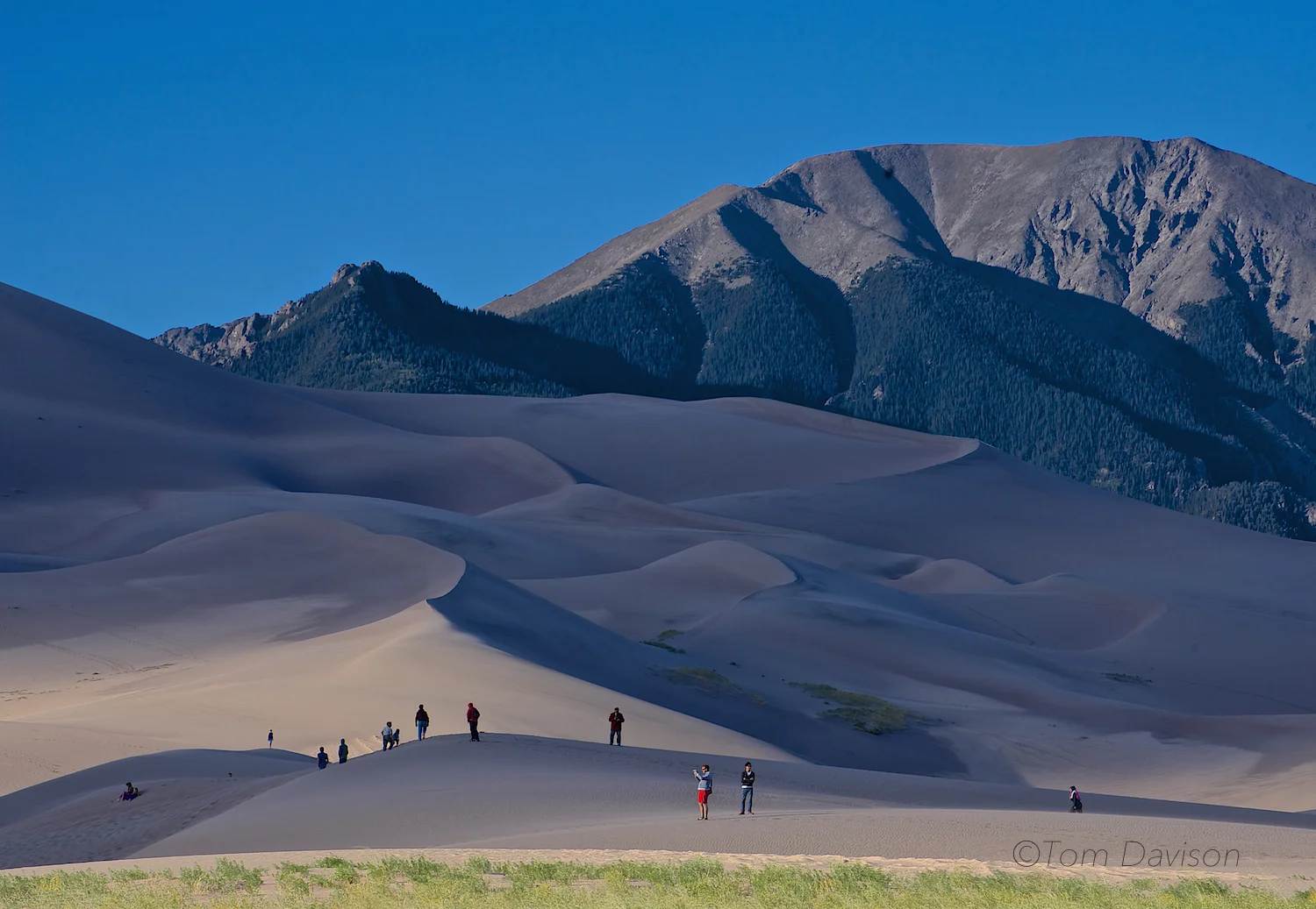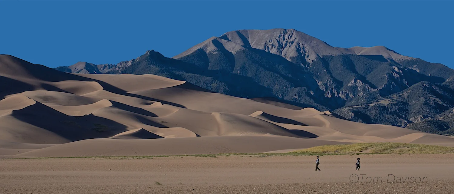 Tom and I spent time last year at Great Sand Dunes National Park. These are the tallest sand dunes in North America, located northeast of Alamosa, CO. The sand is actually blown up here from the San Juan Mountains, some sixty miles away! Last year it was so stormy, rainy, cold and windy that we finally left earlier than we had planned. This year was much more pleasant, although the wind was up enough to sting and make me fret about my camera! One of the most photographically rewarding features of sand dunes, in general, is their ever changing color and perceived topography based on subtle changes in light. The wind also plays a huge part in making sure that dunes are not even the same day to day! At the Great Sand Dunes you also have this huge mountain, part of the Sangre de Cristo mountain range, to add a stark contrast to what appears to be a smooth, creamy landscape. This year we also saw a lot more people as they were not scared away by the weather. They become colorful features that indicate scale. We hope you enjoy the collection!