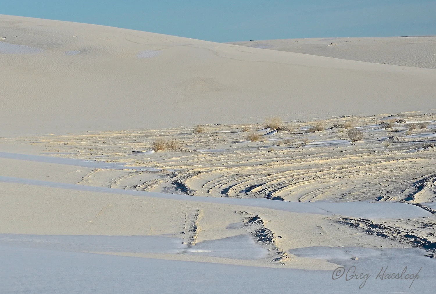 To me, these look more like mounds of sand rather than dunes. Ripple patterns left by melting snow demonstrate that the power of moving water can be just as interesting as ripples caused by moving air.