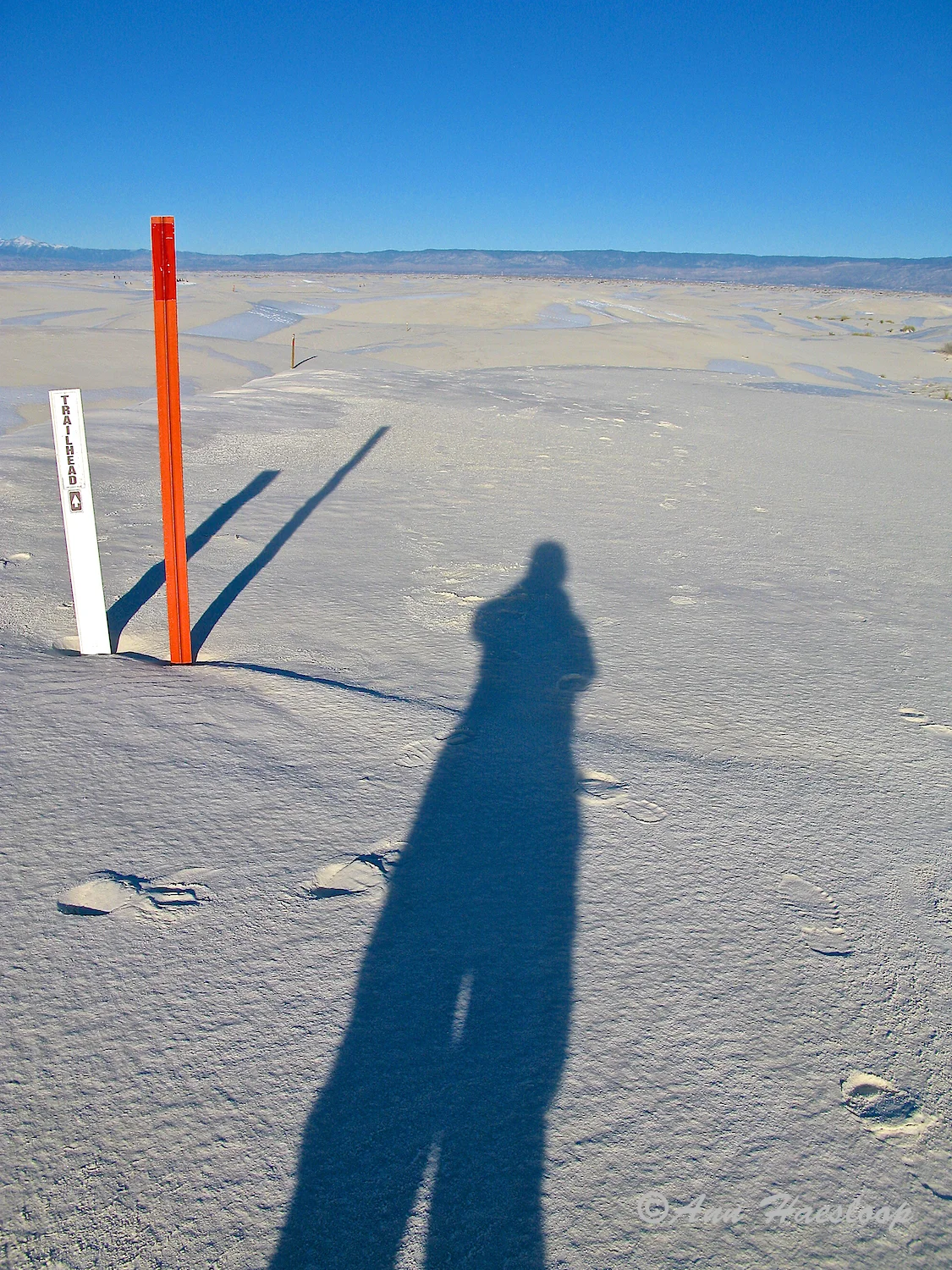Surely not as much snow as there would have been on Friday and Saturday, but still plenty of the white, wet and cold stuff. By Sunday afternoon, however, the footprints were in great abundance as people flocked to check out the monument and there was no wind to smooth out the sand and leave any ridges. And that wet sand was not going anywhere, even in a wind! A very different look to White Sands!