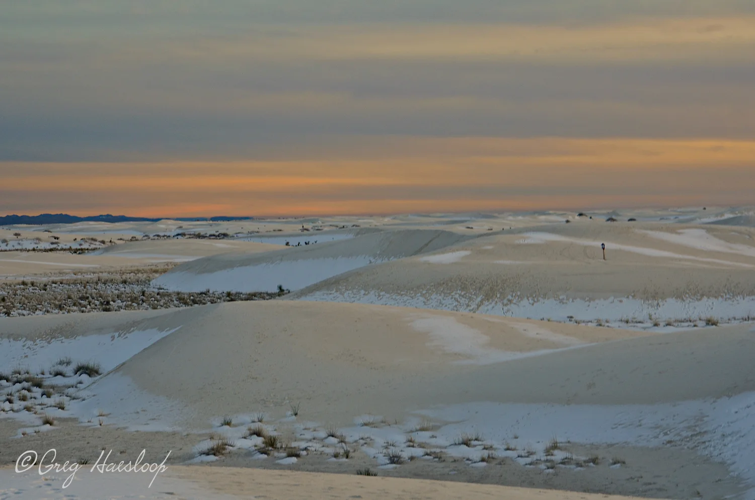 Whether there is snow or just sand, the sun eventually sets, daily, actually. This is looking south as the Ranger drives by and breaks the intensely meditative mood set by this sort of scene. "The monument is now closing. Please head to the exit."