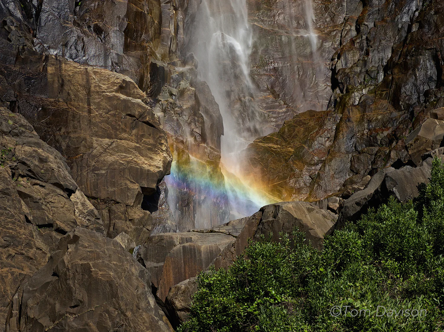 A two rainbow Bridalveil! To get rainbows like this you need the sun to be at the correct angle behind you. It lasts for several minutes. This particular fall is moved back and forth across the rocks by wind, appears very transparent against the dark rocks and is sometimes seen actually falling upwards from the top! I feel the fall is aptly named.