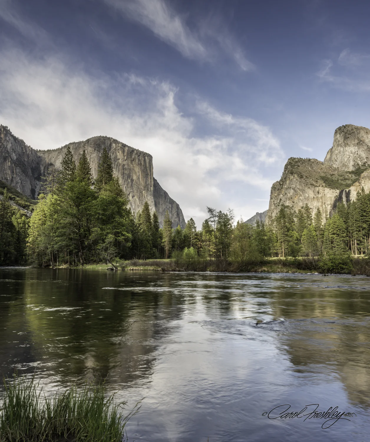 El Capitan from across the Merced River. Tom looked a long time for just the right foreground in place. That is another conundrum in photographing Yosemite, to make a shot special the iconic part has to be framed in an interesting way. A huge granite rock like El Capitan gets old real quick unless we change the window you see it through.