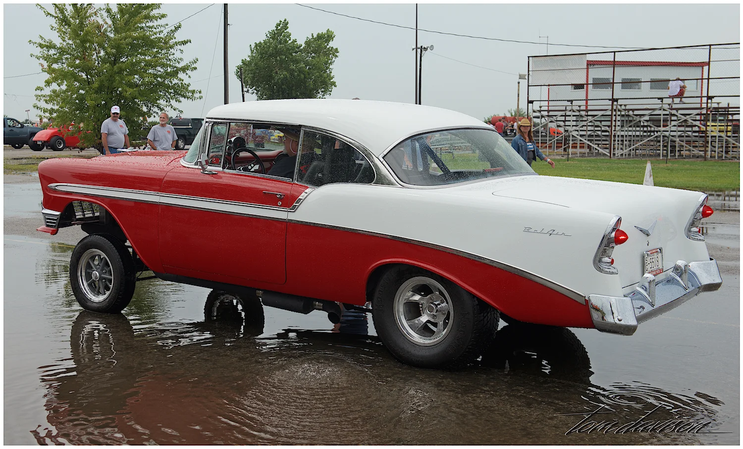 A perfectly restored 1956 Chevy Bel Air re-imagined as a racer. This photo shows how much the heavy rain had fallen in the morning just prior to the opening of the event. The skies started to clear and the crew worked hard to get the race track dried off so cars could race. It turned out to be a beautiful day.