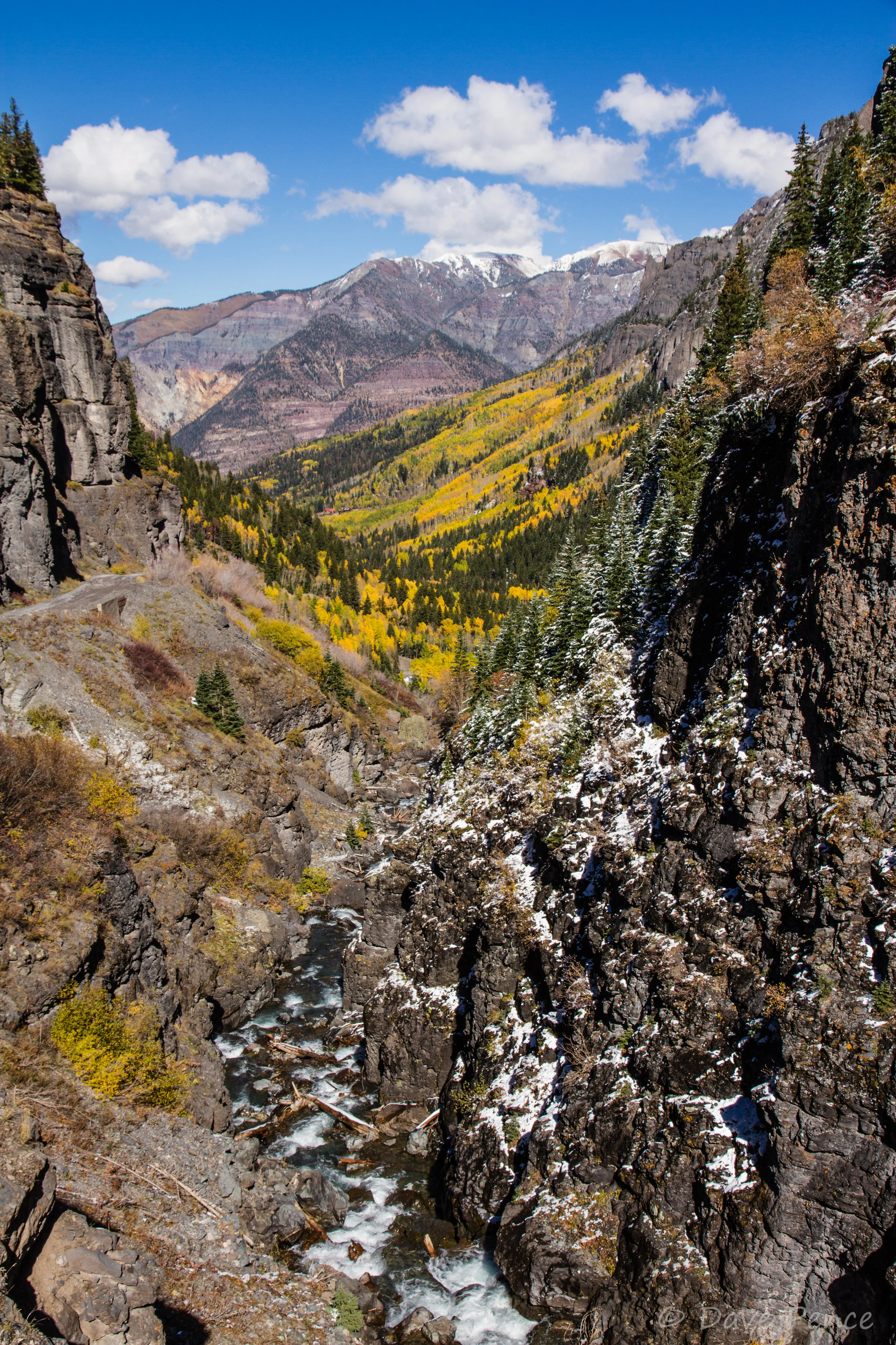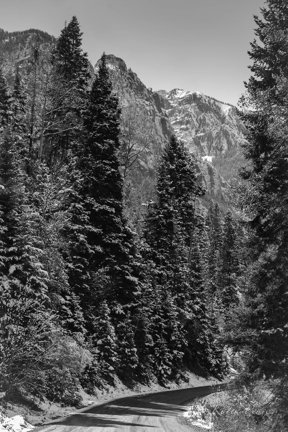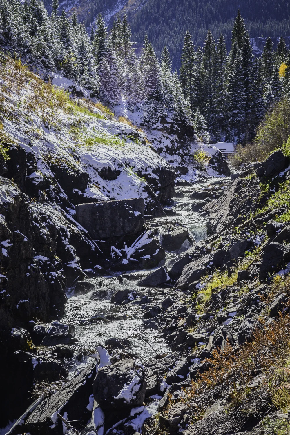 We woke up to a surprise. SNOW!! It had snowed more than a dusting after midnight. Unlike rain, we could not hear the snow on our motor home (Mellie). Dave and Karen were still in Ouray and we decided to 'breakfast up' and find a good photo opportunity. I think it was Dave who suggested a road that started up right from Ouray. The road could be impassable for us at the end and we might not be able to actually get to the Yankee Boy Mine. That was OK with us. We would go as far as we were able while photographing along the way.