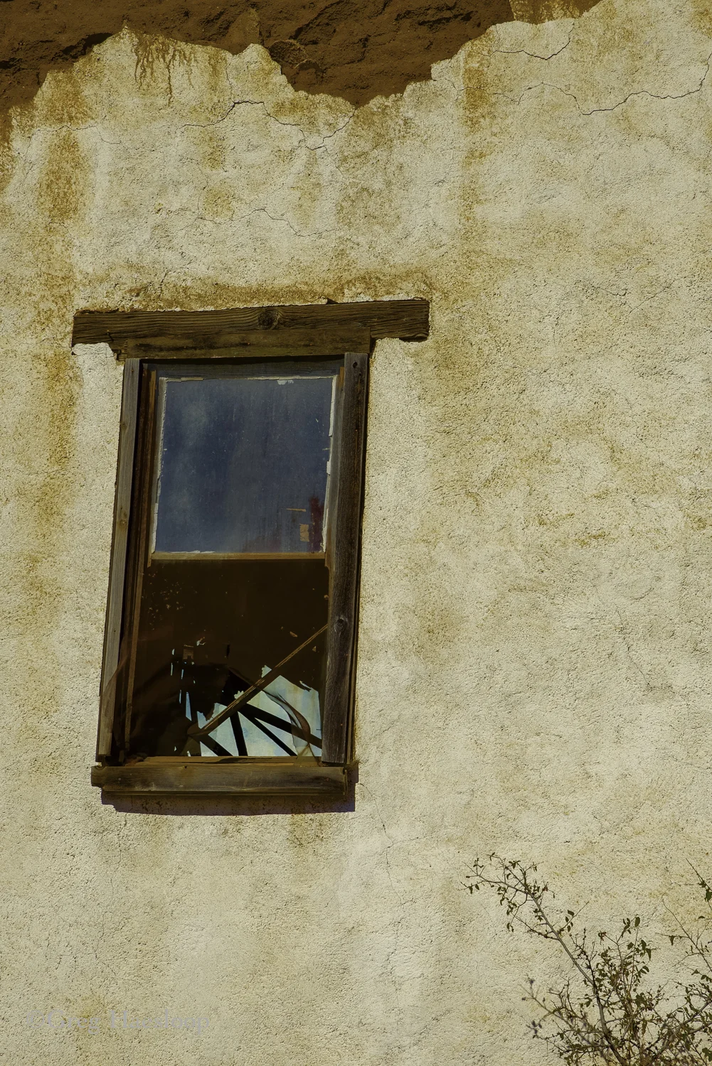 This is an example of walking around to check out photographic opportunities and composition. From afar, this old building was just that. But on more careful examination it showed quite a bit of its true nature. Made of adobe, topped off with a more modern brick chimney and then . . . what is with those old tin cans?