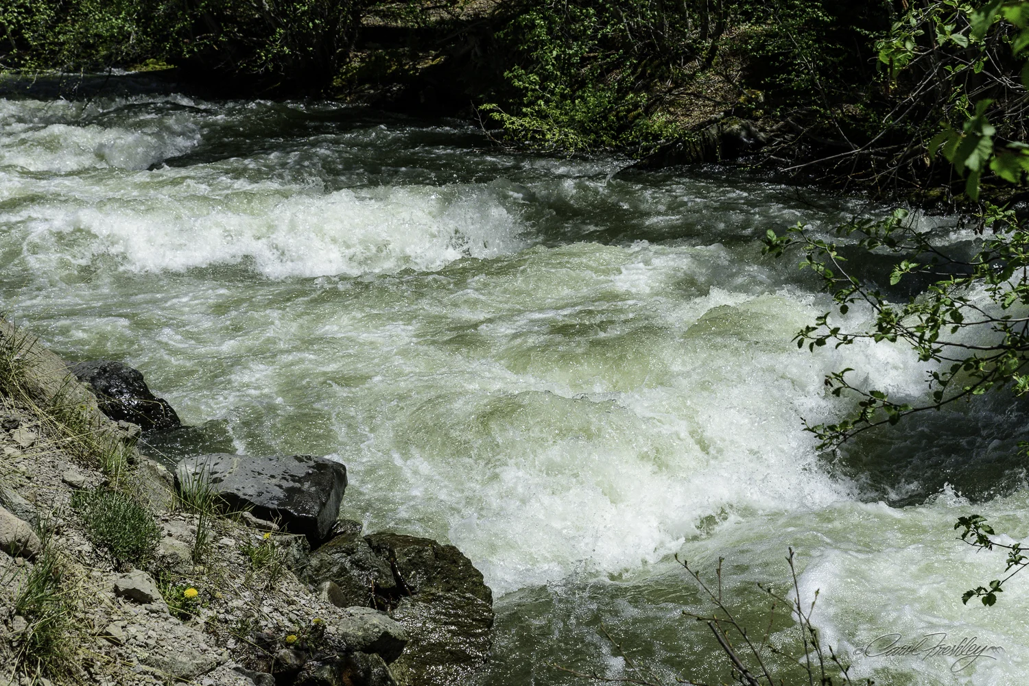 We looked over the information we were given and considered the many options for an afternoon adventure.  We chose to drive CR 20 along Henson Creek towards Engineer Pass.  Our goal was to reach Whitmore Falls but Ms Prissy Prius was not up to the last few miles and it was too late to hike the rest of the way.  Henson Creek is rushing towards the Gunnison River which will join up with the Colorado River at Grand Junction.  Tom had fun with slow shots and I was determined to capture the action.