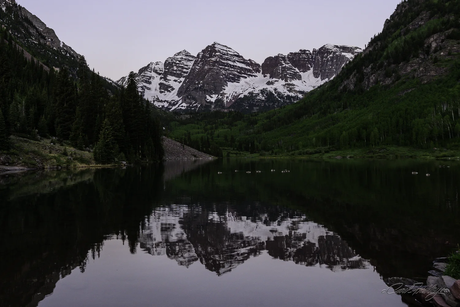 The next morning we arrived lakeside at 5:30 and there were already two photographers that had set up their cameras. There were still some nice locations. A couple more arrived after us. It was cold!! Very cold! Very, very cold. But there was no wind chopping up the water. The reflection was clear. I was stoked!! Someone mentioned the ducks out on the lake.