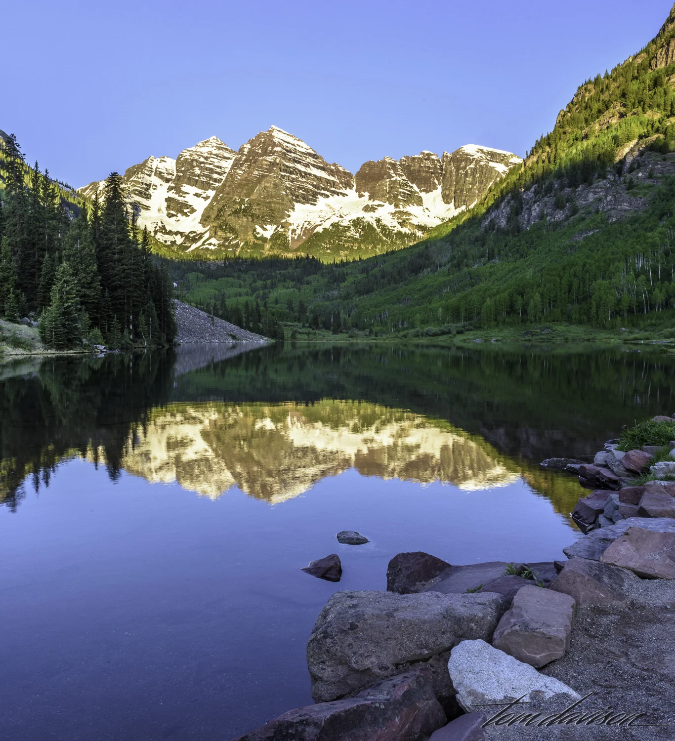The image below is my personal favorite of the photos I took of Maroon Bells at sunrise. I stopped shooting once the sunlight reached the tops of the trees and returned to the car to thaw out!