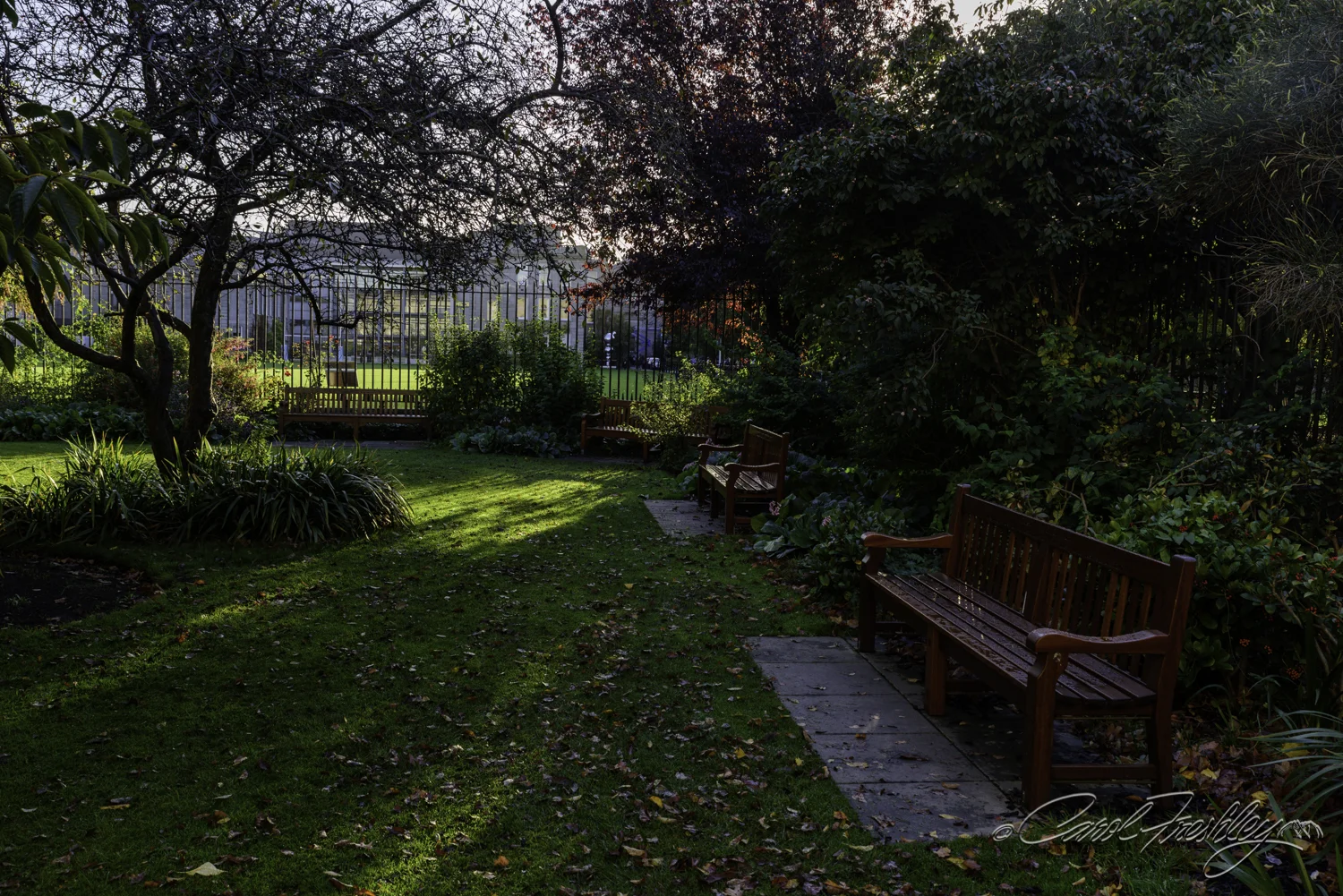 Intimate gardens are well tended.  It had rained over night so the grass and benches were wet.