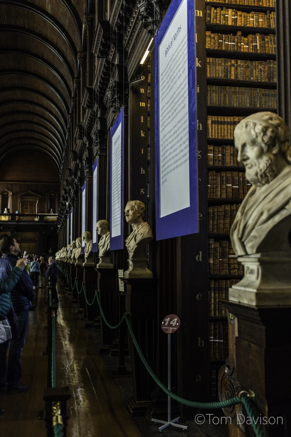 This is the highlight of any visit to Trinity College.  The Library and the Book of Kells.  No photos are allowed on the lower floor where the exhibits are placed.  The upper floor or Long Room allows photographs but no flash or tripods.  It is quite dark.  We arrived shortly after the Library opened.  Big mistake not to be first in line and head right up to the Long Room.  Save the exhibits for later.  By the time we got started the room was already crowded.  I really encourage you to do some research on this rare library.