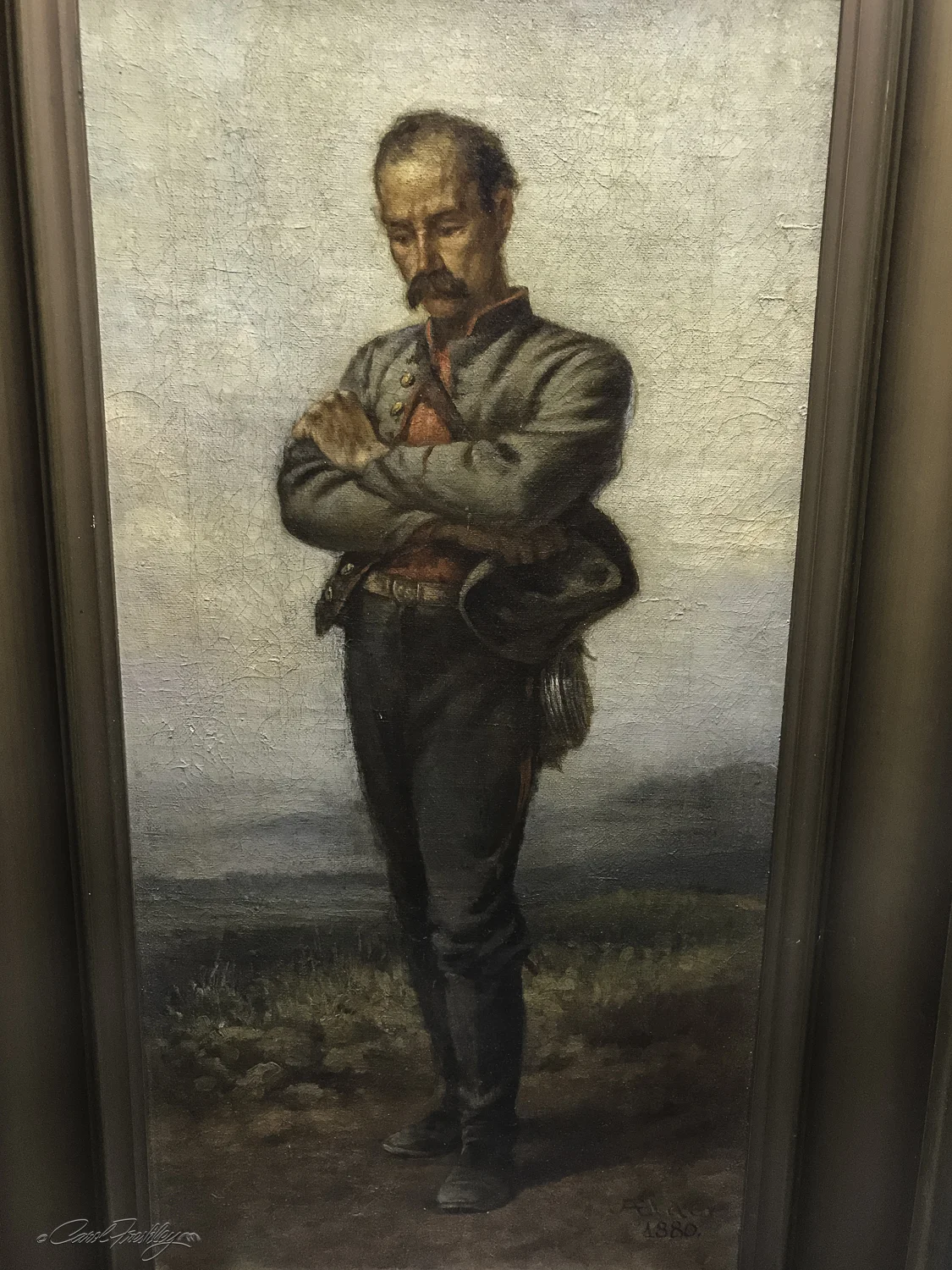 "Appomattox" by John Elder, an 1880 oil painting signed and dated by the artist. It is a compelling portrait of a Confederate soldier following the surrender of General Lee. The soldier is portrayed with arms crossed and head slightly bowed, with downcast eyes - typifying the blend of defiance and sorrow felt after the surrender.