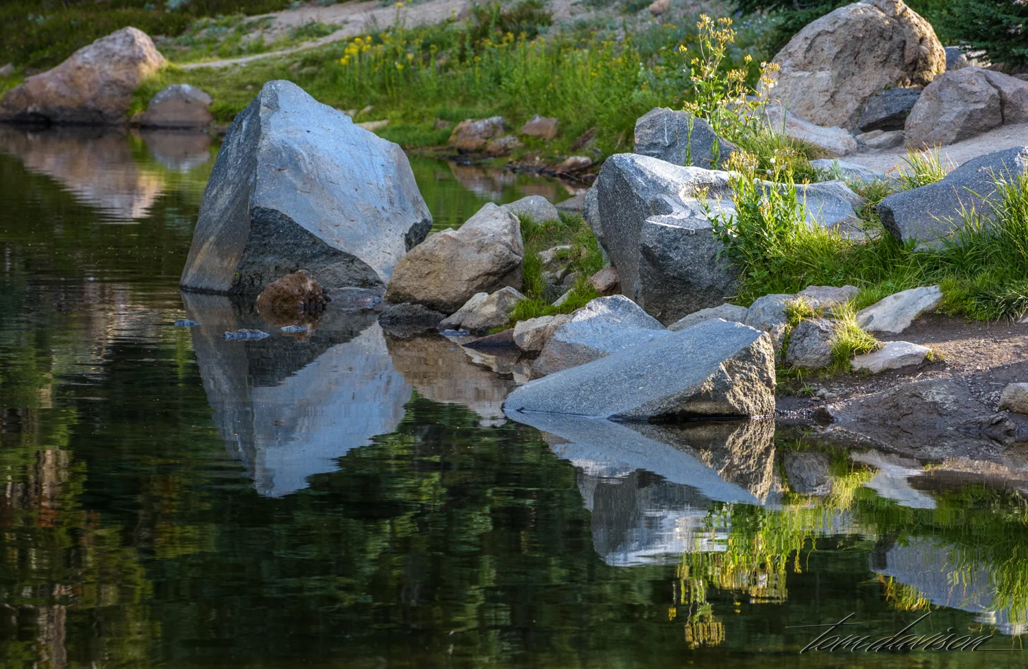Emerald Lake is home to the Cascade Frog, Rama cascadae. Trout that were introduced at one time almost eradicated the frog and now the trout are being removed in hopes that the frog will have a fighting chance to escape extinction. The Cascade Frog lives in wetlands from near sea level to high mountains and is considered a 'Species of Special Concern in California'. This is the highest elevation that they have been found. It is thought that the frog was transported to the lake by being stuck on the foot of a migrating waterfowl.