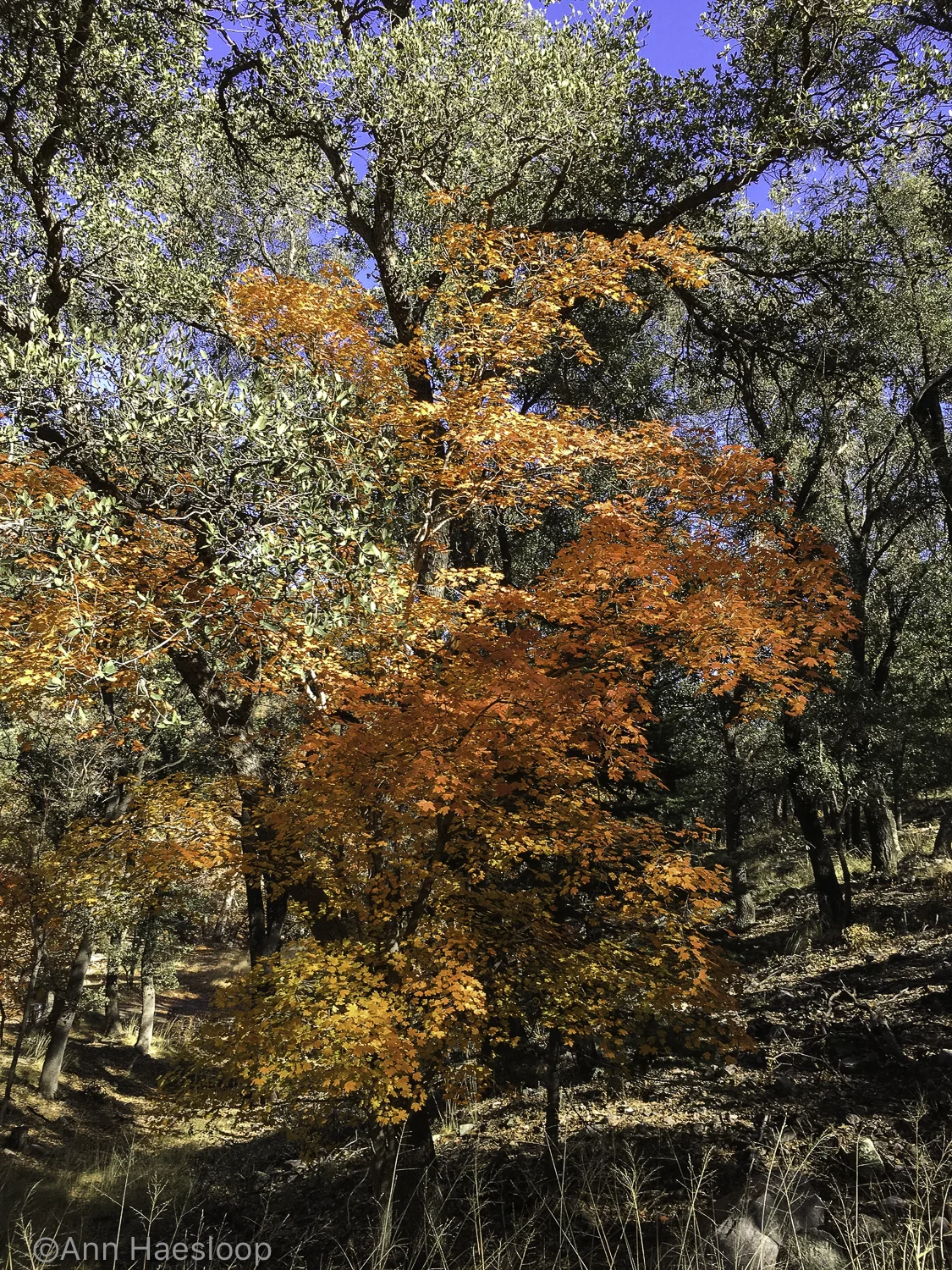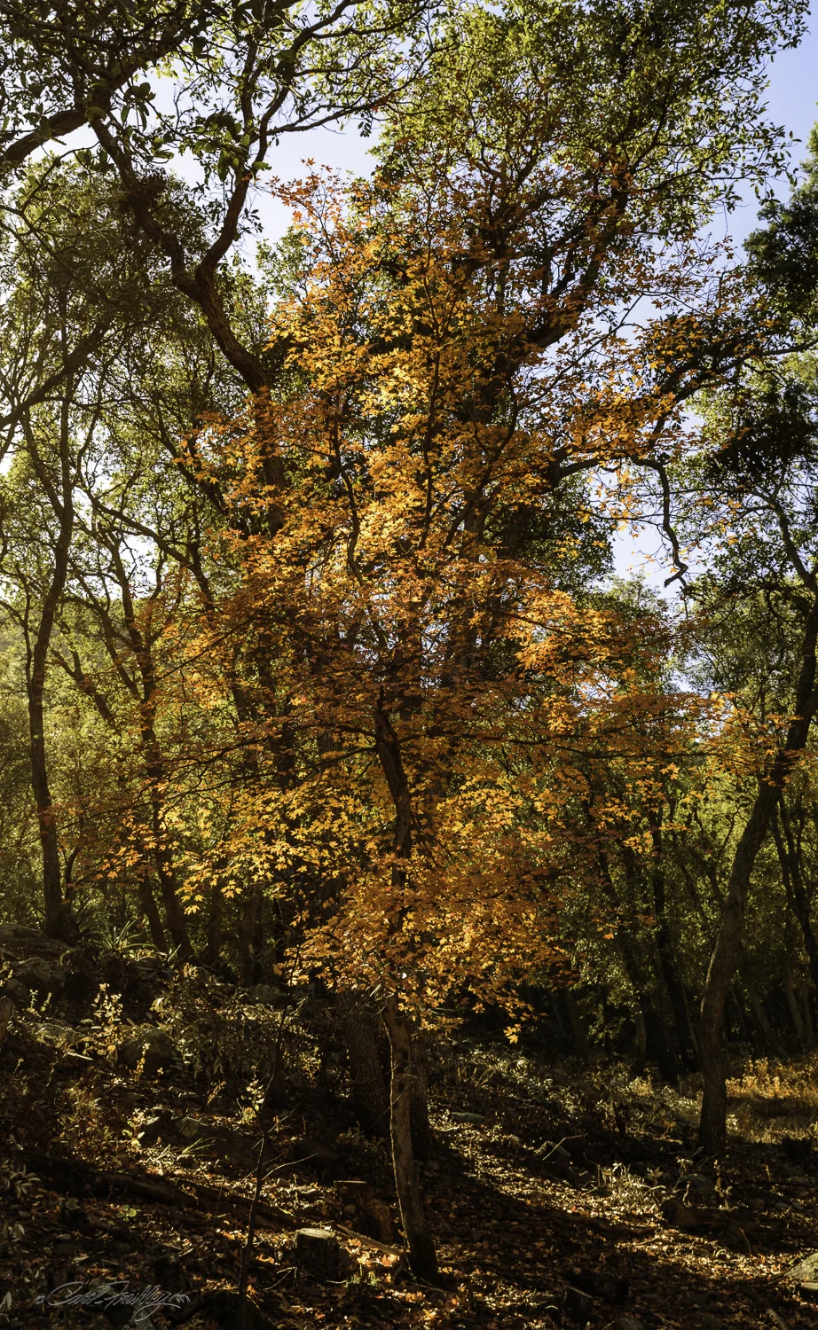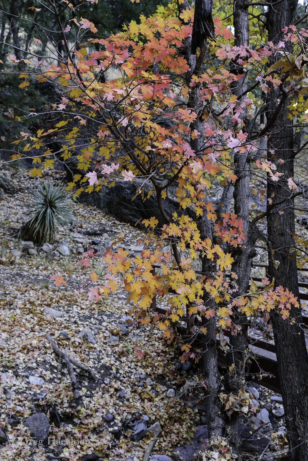 Ramsey Canyon is referred to as the 'hummingbird capital of the world'. Its tall canyon walls and presence of Ramsey Creek keep it cooler than the surrounding desert and an ideal place for wildlife, especially birds. There are 15 different varieties of hummingbirds that can be found here. Ramsey Canyon is part of The Nature Conservancy’s international conservation program cooperates with several agencies to both preserve and better understand fire management, stream restoration, and protection of rare species. When we arrived, just as the Information Center opened, it was very cold! We were hoping for some fall color and were surprised at just how brilliant some of the trees were. It was probably just past 'peak' but we took it all in! For the birders in our group, we were told that two Trogon males had been spotted in the area. We, of course did not see them.