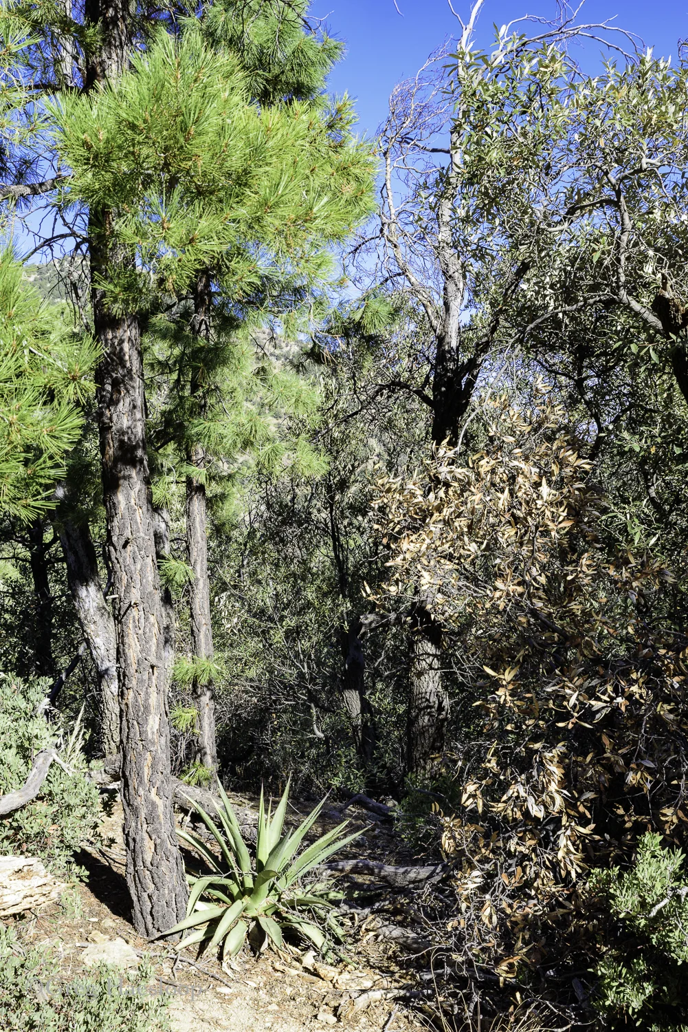 You walk under this branch to start walking up the trail.