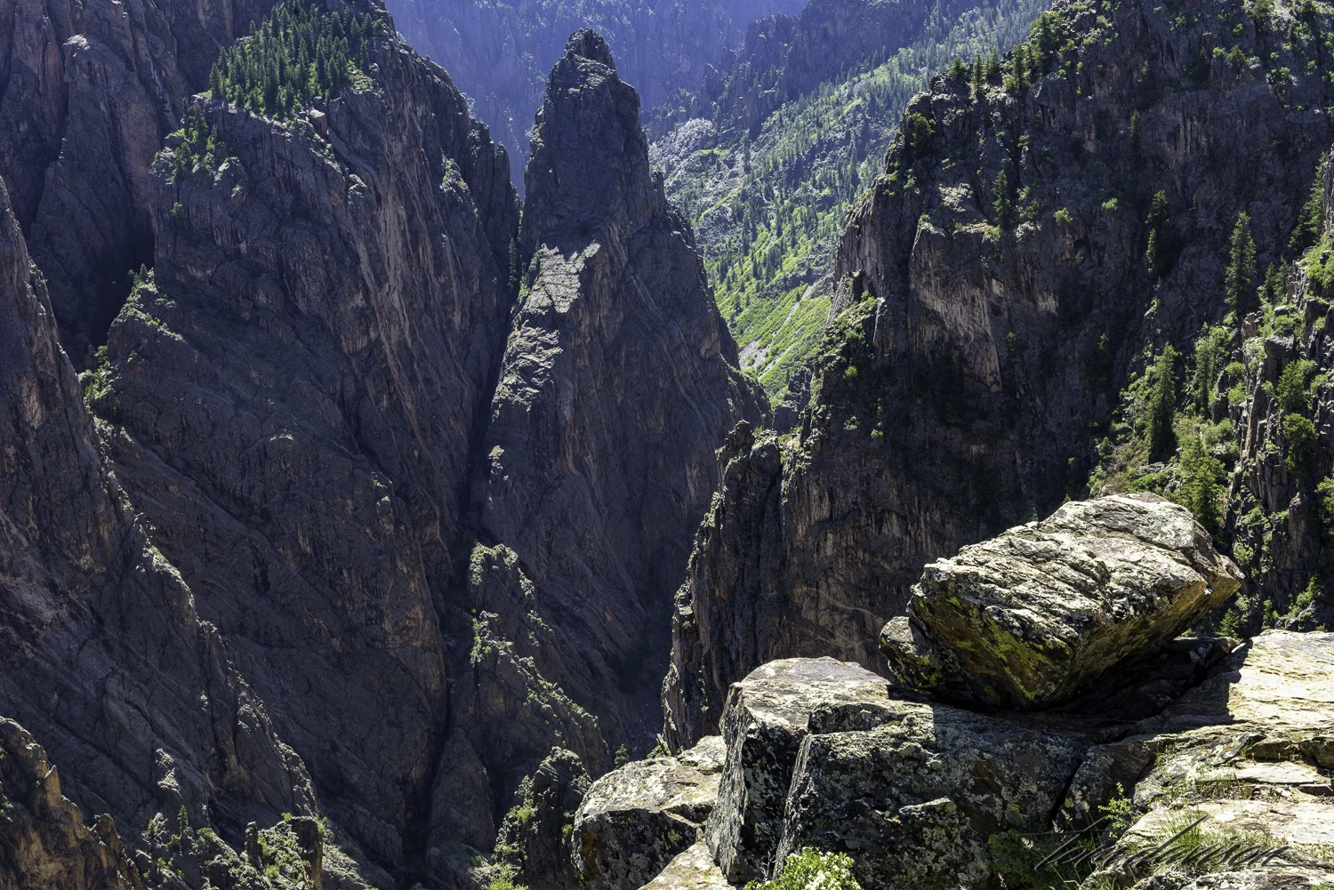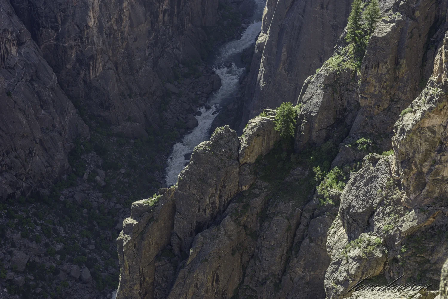 Photographers often skip the middle of the day's harsh light. Not a good option at Black Canyon as sometimes that is the best time to capture light looking down the deep canyon . . . can you spot the Gunnison River? Yep, that little spot of light! I wish you could hear the roar to go with it.