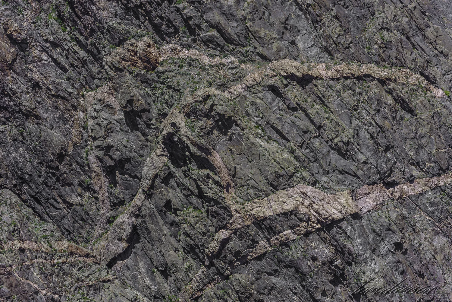 Steep canyon walls just add to the sense of grandeur of the place. Dynamic range aside, add what I called rock wall graffiti and you get a wonderful appreciation of what has been created here. The best example of this can be seen at Painted Wall. This massive rock wall rises 2,250 feet above the river. What makes it so interesting are the pegmatite intrusions that run against a dark schist. We saw these intrusions throughout the canyon but none quite as impressive as those on the Painted Wall. They are also viewed at Dragon Point and Cedar Point. Some of the intrusions have names, such as 'Dragon'.