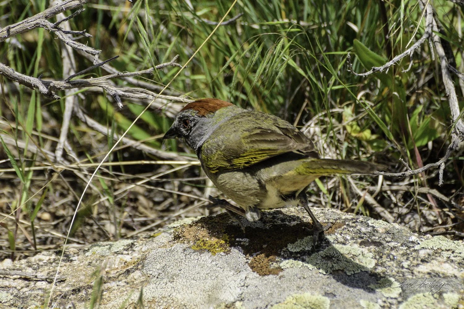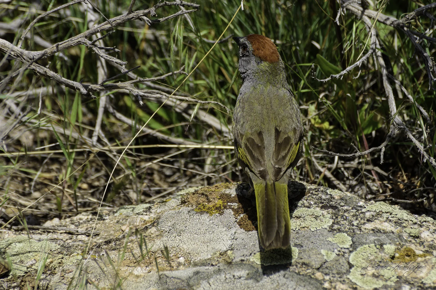 I have no idea what kind of bird this is. But, I tried so hard to get a great bird photograph in honor of my birding friends. I will call this a "pretty bird' based on Elaine's expert advice on how to name a bird when you are not sure. This one actually waited patiently . . . Note: Elaine identified this as a Green-tailed towhee. Thanks Elaine!