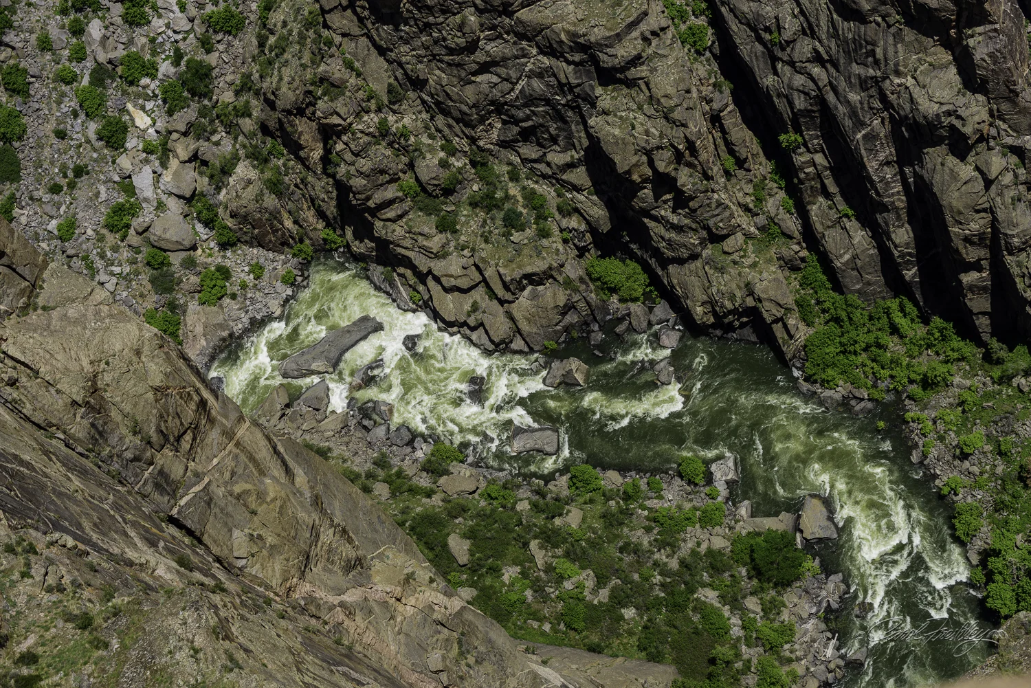 Yes, if you look way down into the bottom of the canyon, where the bright wall meets the dark shadows on the near wall, you see the Gunnison River. You can barely see the forceful whitewater rapids. No rafting, canoeing, or kayaking is allowed in this part of the park, especially in the spring when the water is at such a high level.