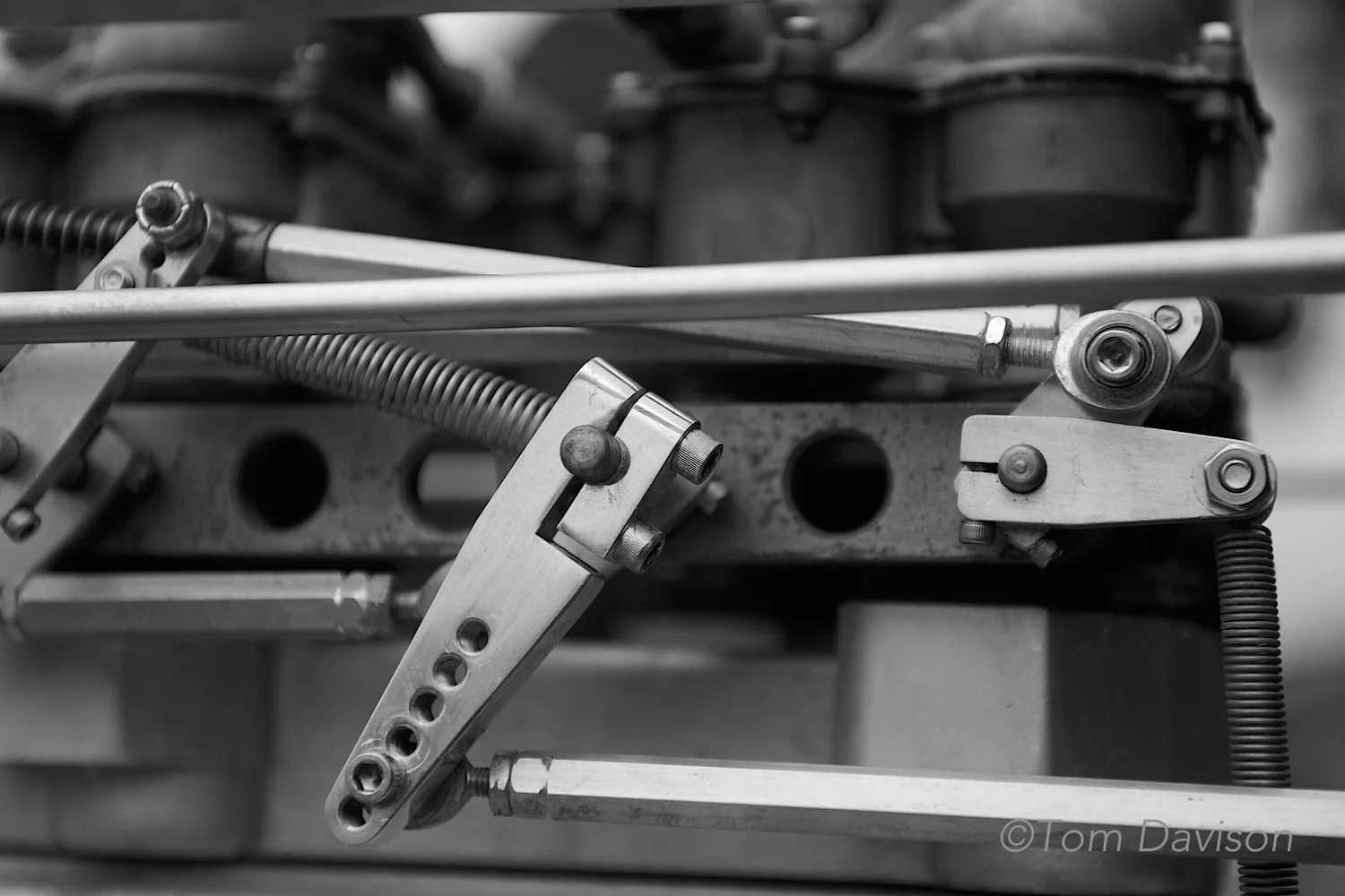 This is detail of a handmade throttle linkage on a supercharged Oldsmobile engine.