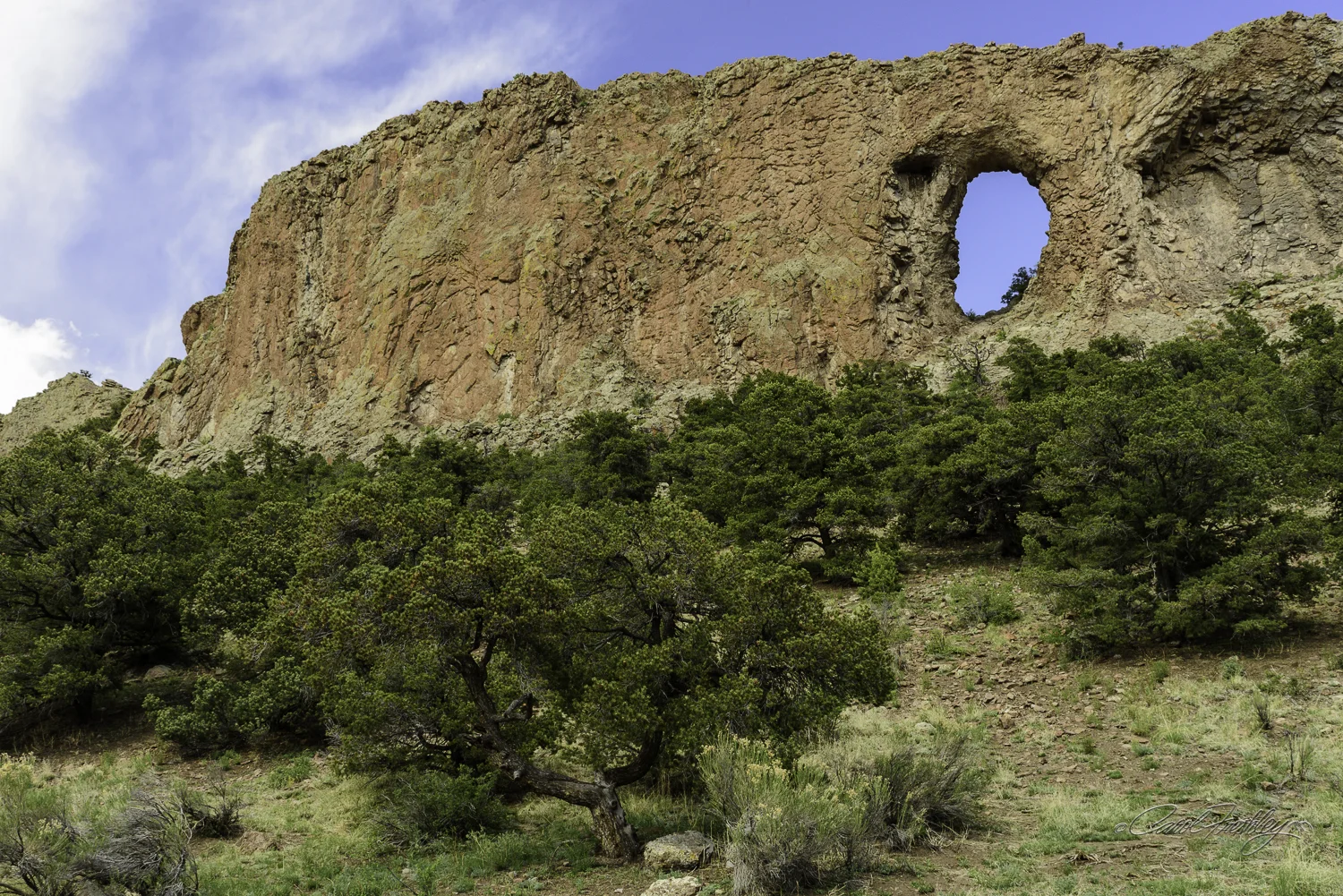 We drove through Lake City and decided it would be on a short list of places to visit from our Gunnison camp. We dined at the Altitude Restaurant (very, very nice) and returned quickly to South Fork. The next day we took off about midday for Natural Arch. That was another adventure. We started off missing an obvious turn and getting lost before doubling back. Then we opted for longer route thinking the county road might be smoother. Wrong! We stopped along the way because no matter which way we went the scenery was just spectacular at every turn. I rode the high side of deep ruts in the road, constantly checked to make sure we still had cell phone contact and kept wondering where the signs were for this well known landmark. We were rewarded when we got to the site.