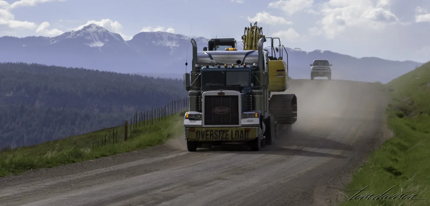 When we reached the end of FS 631 we came upon a huge semi with a flat bed trailer. There were guys just standing around and with a bit of inquiry we found out that they had delivered a HUGE piece of equipment to the farm down below in the valley. We could hear the shovel working away. As we finished up our shooting (about an hour) and headed back down the road we saw that they had loaded the shovel onto the truck. My first thought was to get in front of them or I would be stuck on a narrow county road going even slower than my usual 15 mph. Oh, so not correct!! I had barely driven 5 miles and I could hear this truck barreling down the road behind me. This truck was speeding!!!! I quickly picked up my pace and saw a bit more distance between us but still had to keep up my speed. Only later did I realize that I should have found a wide spot in the road and let him pass me. Oh, wide spot? Not easy to find. And, we would have been chewing his dust for days. Finally, we managed to pull off a side road and slightly up a hill. Tom jumped out to try and get a 'safe' head-on shot of what I now thought was a BEAST! We then followed him at a safe and relatively dust free distance until we got into town.