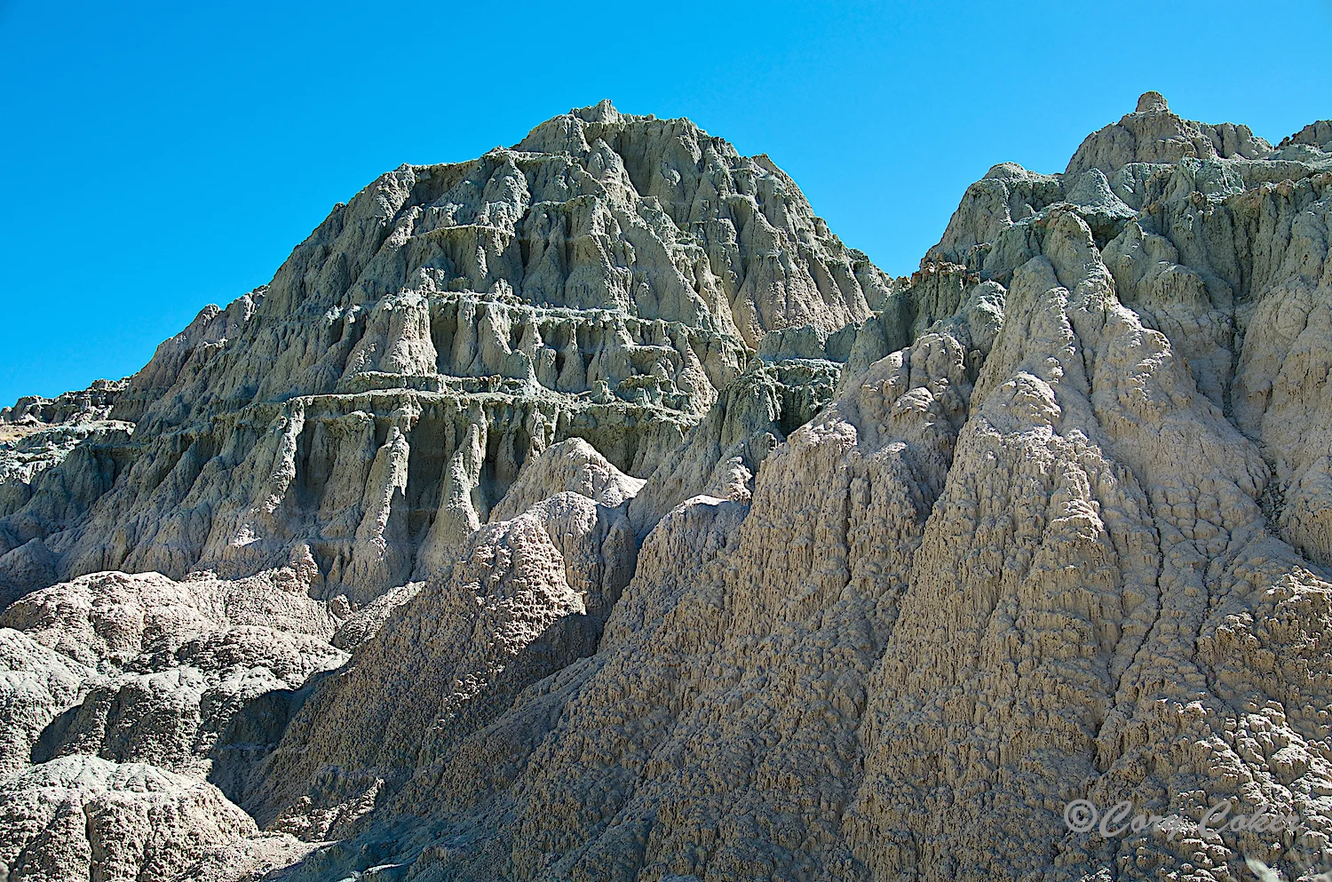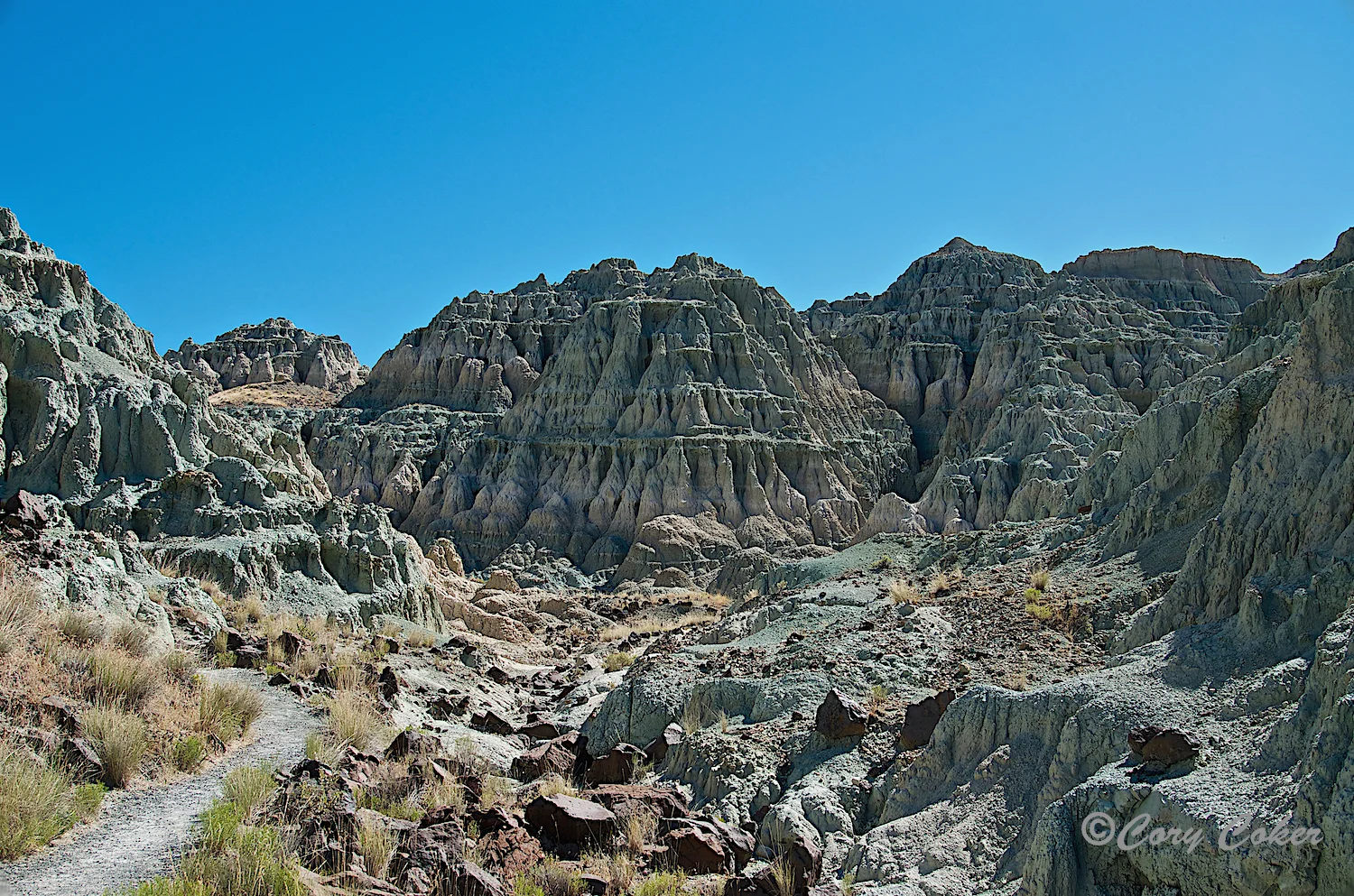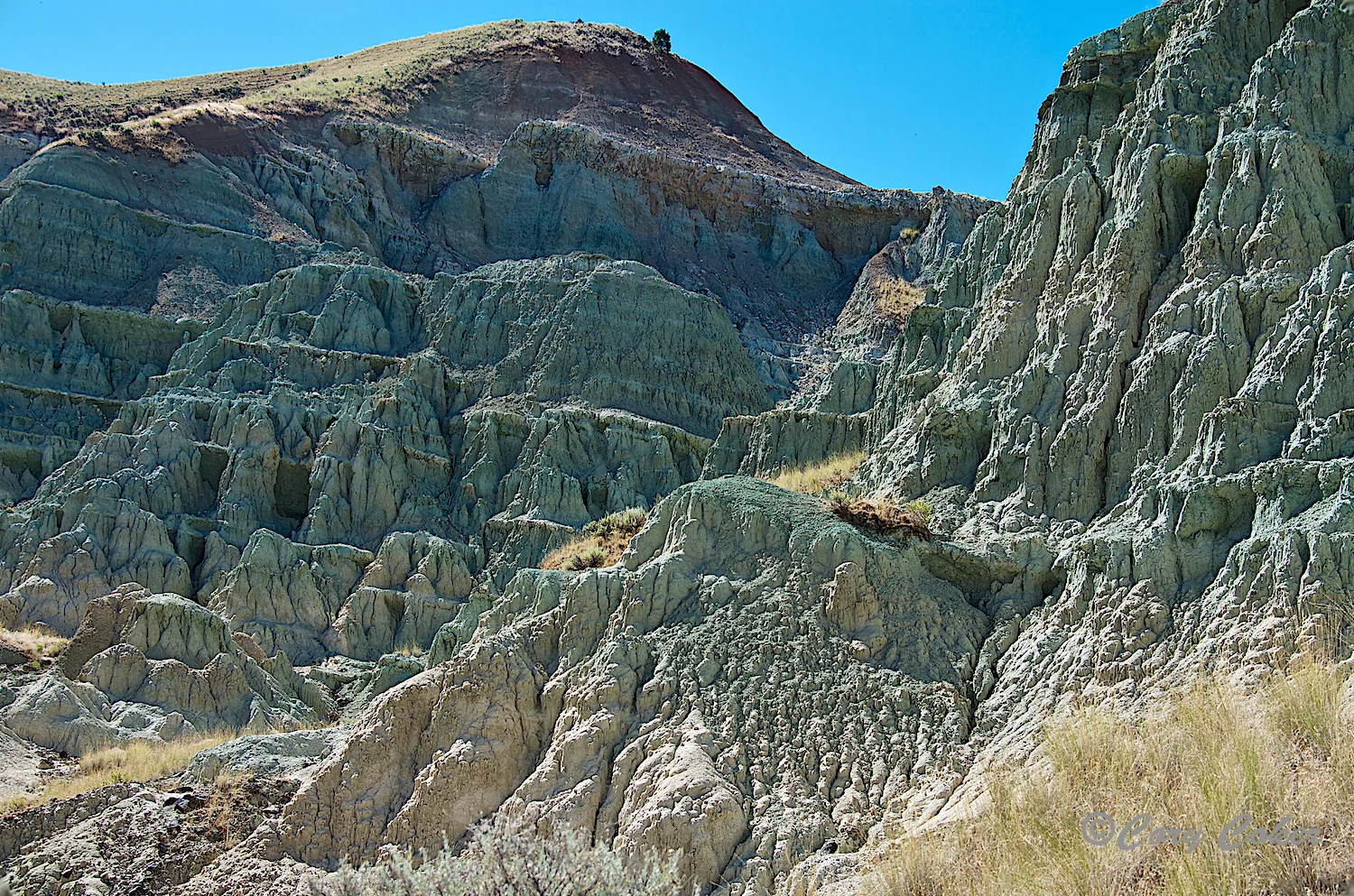 In addition to the Painted Hills, Cory photographed the Blue Basin. She tells us, " The Blue Basin is centered on an outcrop of grey-bluegreen colored badlands, very heavily eroded with no vegetation and split by a branched ravine. The Basin is one of the more important fossil sites in the John Day Fossil Beds National Monument. The brightly colored rocks were originally volcanic ash, resulting from eruptions around 29 million years ago. They really are this color, it's surreal.