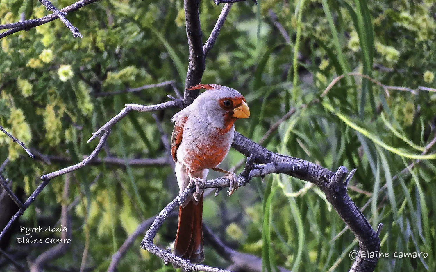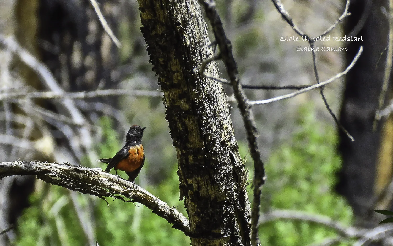 Before we go further, let me share part of one photographer's notes to me. She wrote, "The first 'find of the trip’ was the Slate-throated Redstart. Per the Audubon Society, “The Slate-throated Redstart has wandered north from Mexico into the American Southwest only a few times…” So needless to say when it was spotted near Portal, the siting drew birders from far and wide. It’s location is off the bumpy, windy, dirt road called Pinery Road which leads ‘the back way’ to the Chiricahua National Monument. Birders try to be very specific about a special bird's location so it can be seen by other birders. One birder, after many tries to find it, finally placed a cairn made of rocks and sticks and marked it with STRE! Thanks to him we were able to find the spot and thanks to God we actually got to see him! He was quite busy gathering sticks for his nest so it made it very hard to photograph. Elaine, however was fairly successful! The down side, is that it has been reported that disrespectful birders are now tromping around disturbing the area to find the nest, a big no-no in the birding world."
