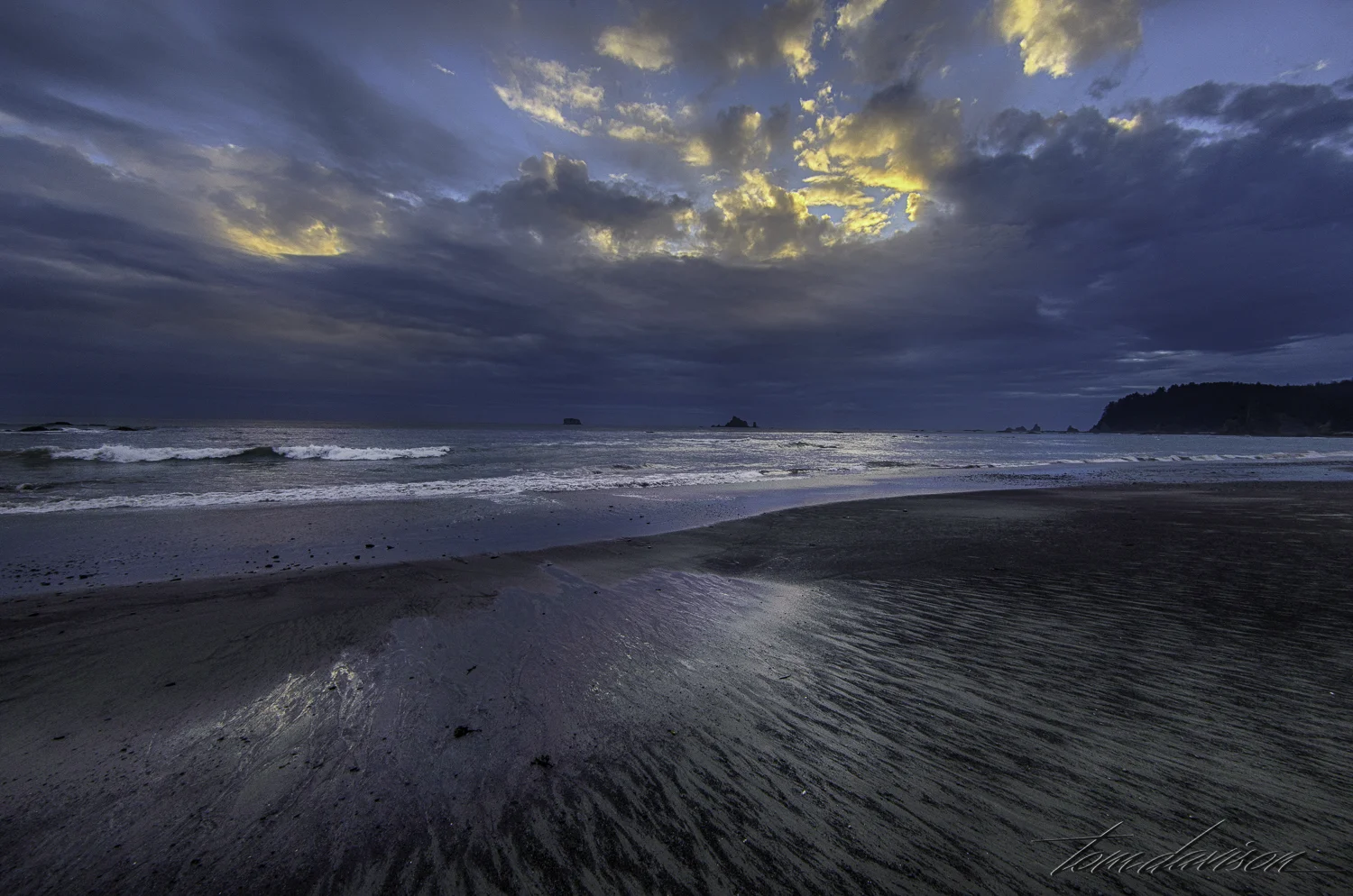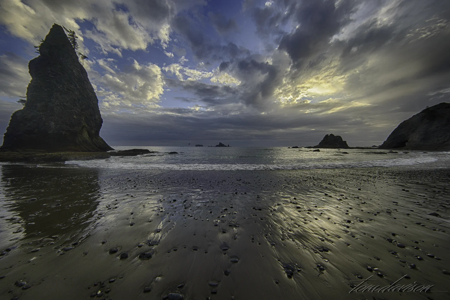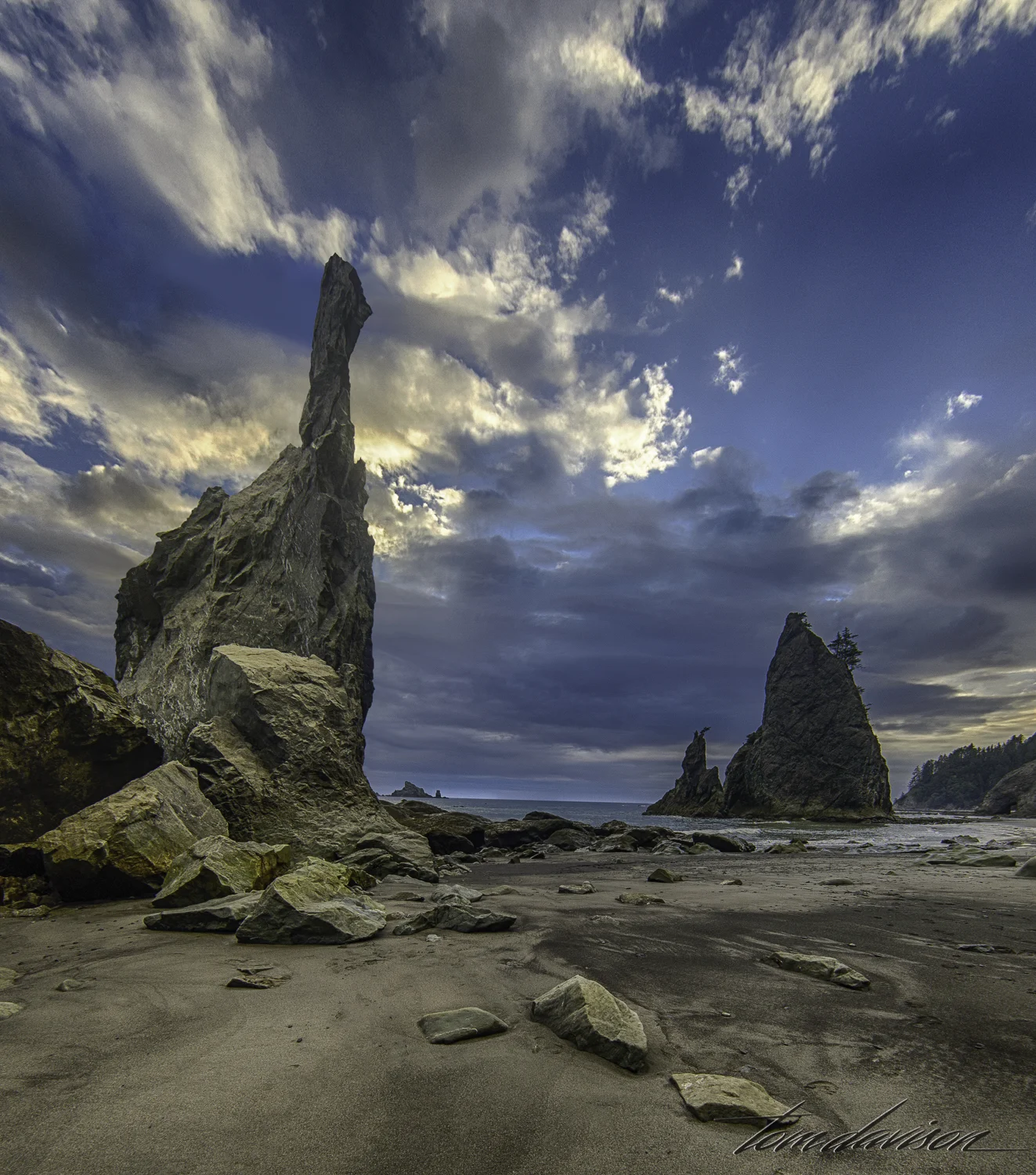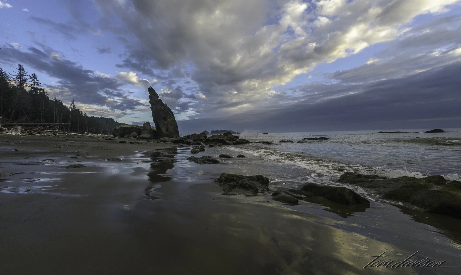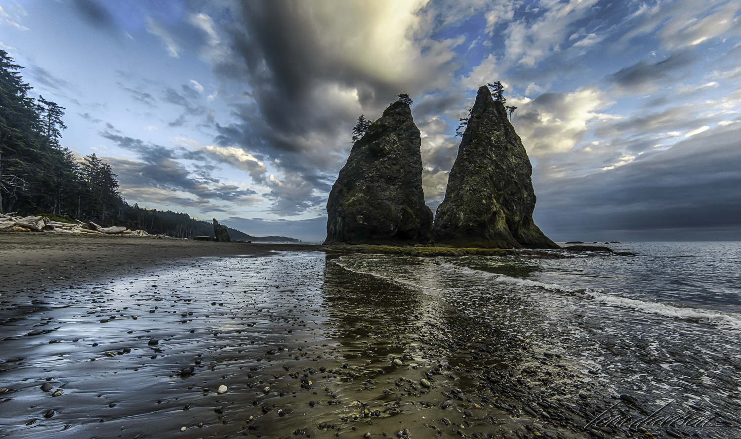 Rialto Beach is near the mouth of the Quillayute River. It is highly regarded as a great beach for sunset photography. However, the whole time we were camped in Forks, WA the cloud cover, especially on the horizon, was too dense to contribute to a nice sunset.  The sea stacks are about a mile hike from the parking lot. Large tree trunks are washed up on the beach and can make for difficult hiking as one navigates around and over them.