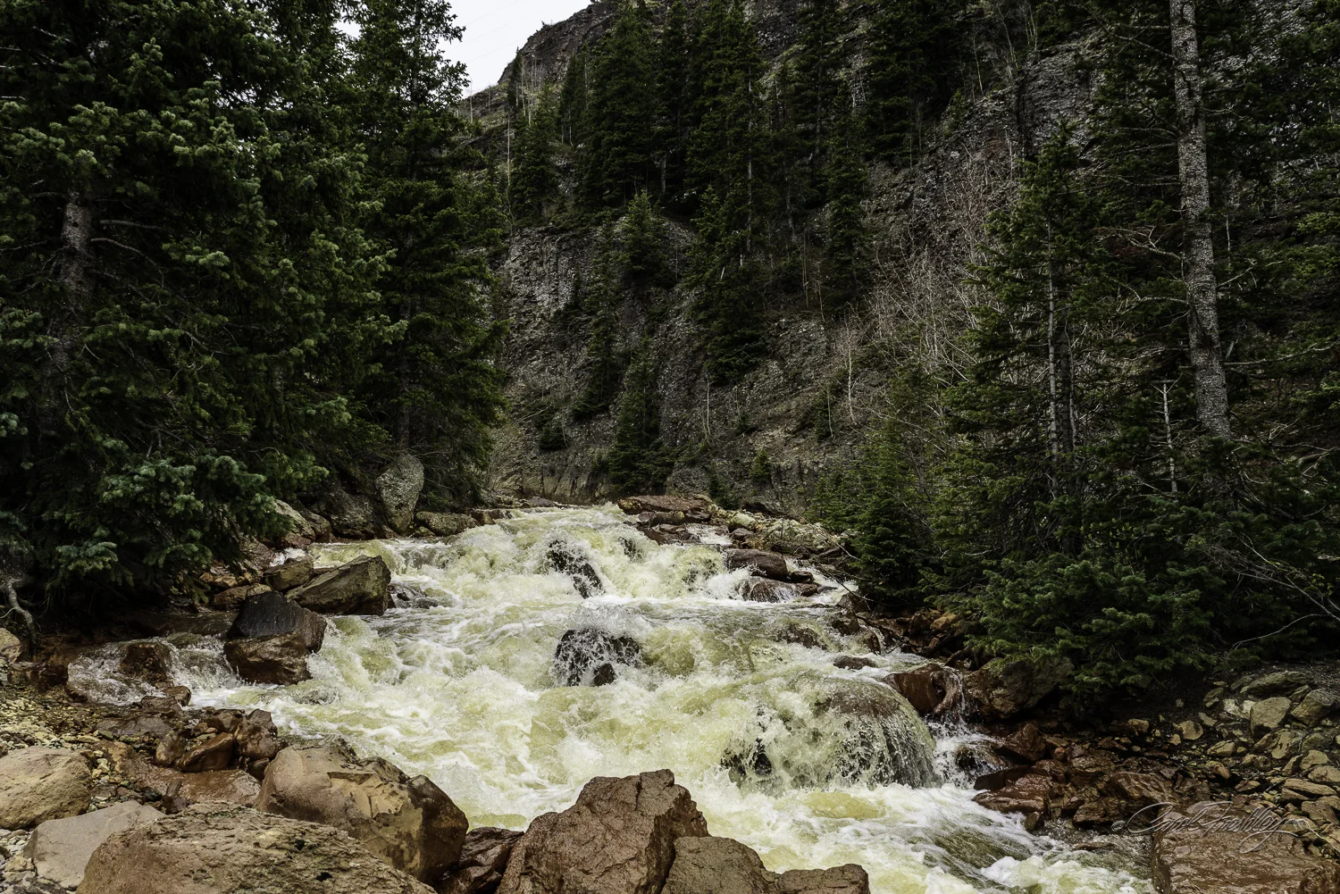 Streams and rivers are running with a lot of force this spring in Colorado.  I wish I could include the roar for you.  By the time we got to this stream the weather was looking ominously like snow was on the way.
