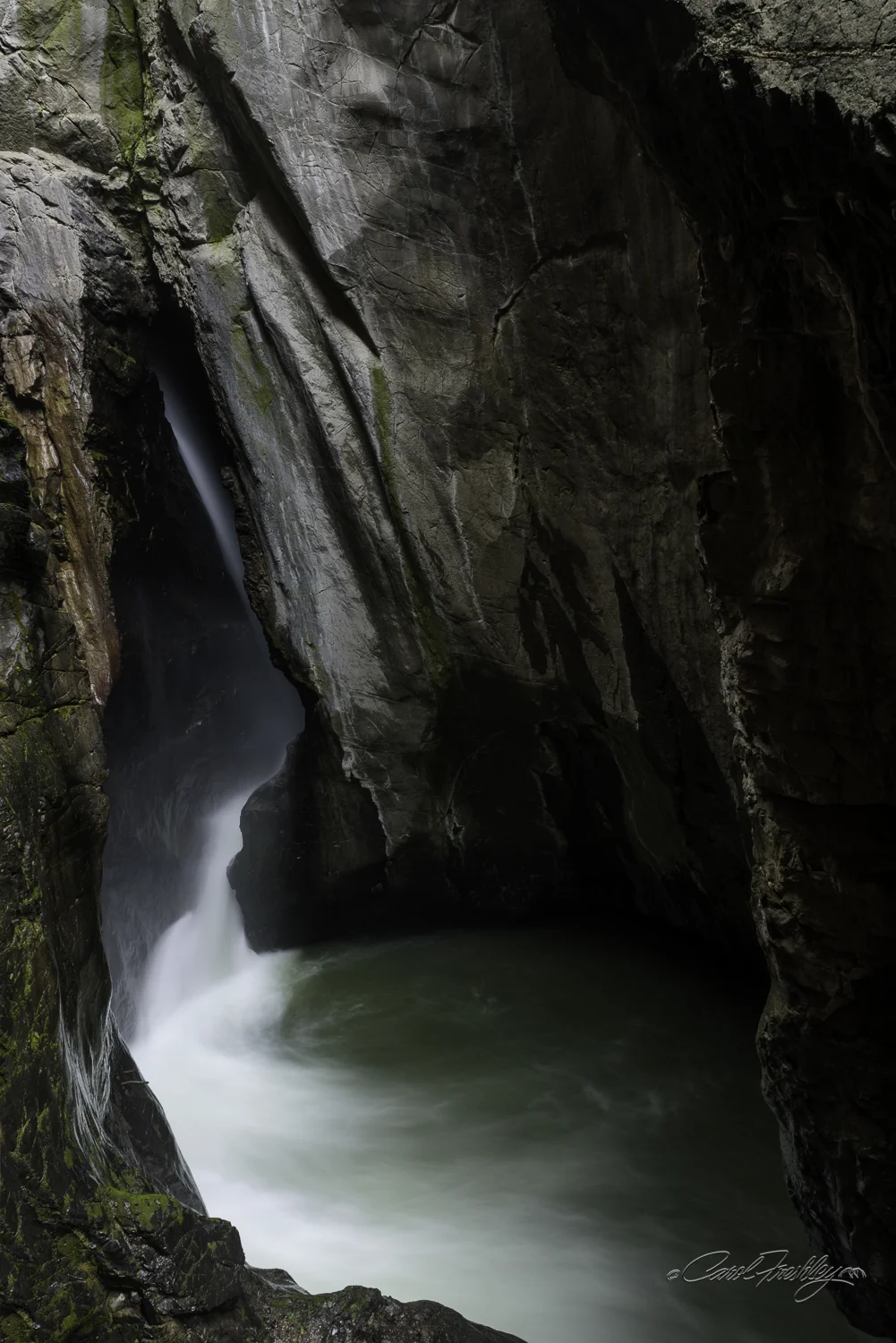 Here is one interpretation of the waterfall as it comes from behind the rock.  The sound is frightening and there is water spray everywhere.  I wanted a fast shot to show the drama but simply could get my camera set up to capture the speed and force of the water.