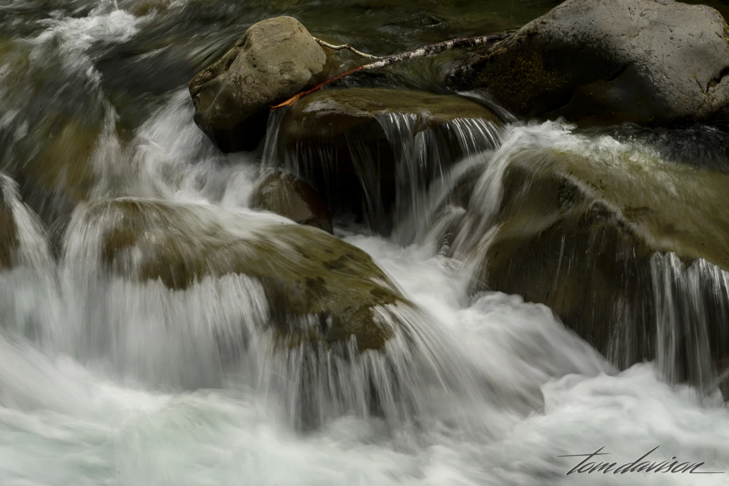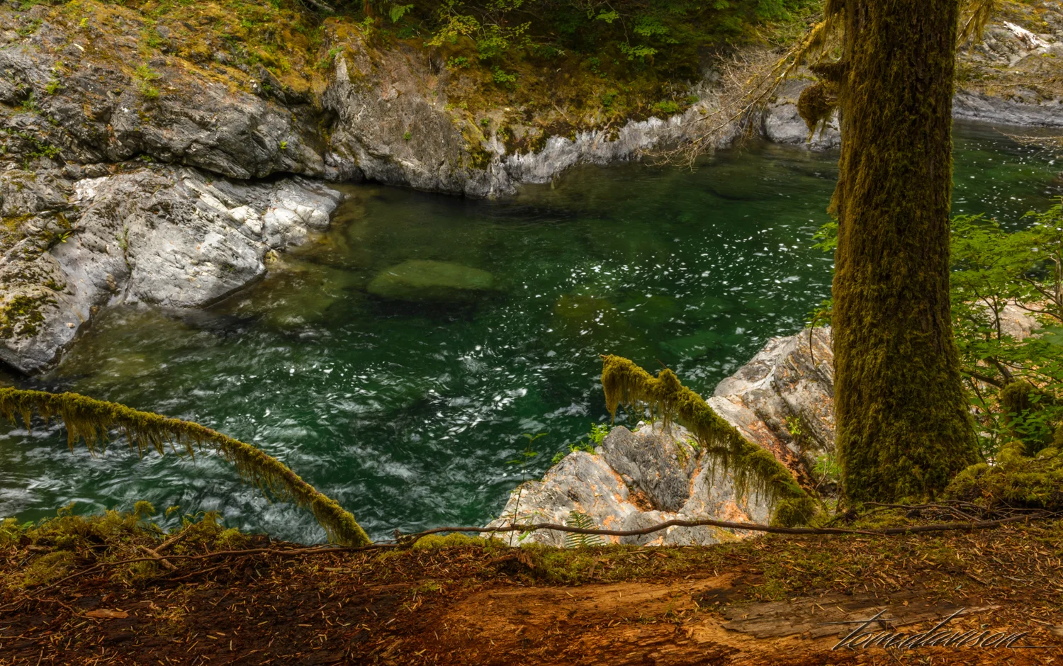 The water is filled with air as it comes over the rocks and looks a bit frothy as it enters the stream below. My guess is that salmon, jumping up over the rocks would appreciate that extra oxygen. I wanted to find a golden salmon down there . . . not on this day!