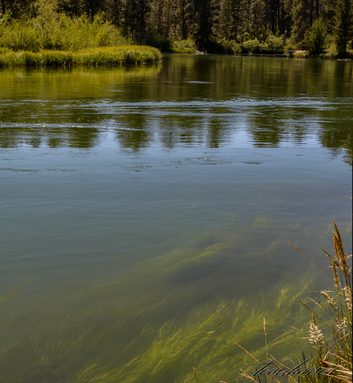 In addition to the lake we wanted to get a photo that Tom had in his mind of the Deschutes River flowing between banks with a meadow-like look on each side. We had checked out several sites but not found what he was looking for. So, after checking out the lake, we returned to Bend and had our picnic lunch looking over the river and watching people in kayaks, canoes, tubes, and boards enjoy floating down the river. We left with full bellies to see if we could find the right place. We ended up driving slowly about 25 miles on washboard roads before giving up and just trying one road that we hoped would lead to a spot in the river that was 'just right'. It was not the one but we took some photographs anyway.