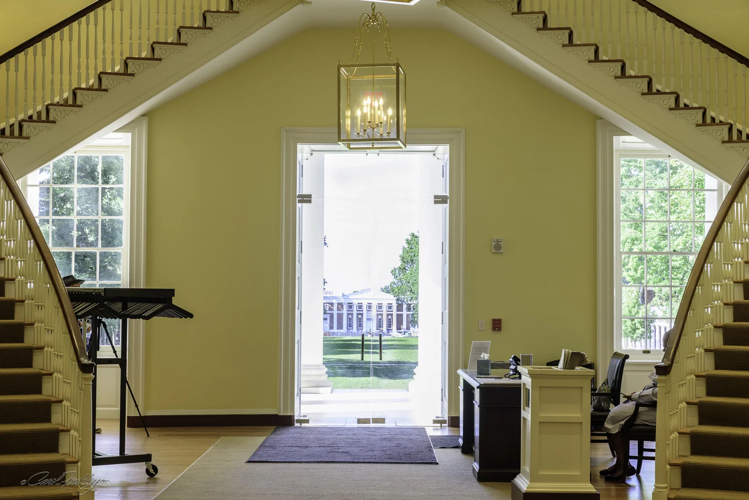 If you turn around, away from the statue of Thomas Jefferson, you look across the lawn and at the end you see Old Cabell Hall.  A receptionist welcomes all students and visitors and is the source of some really good information about the facili…
