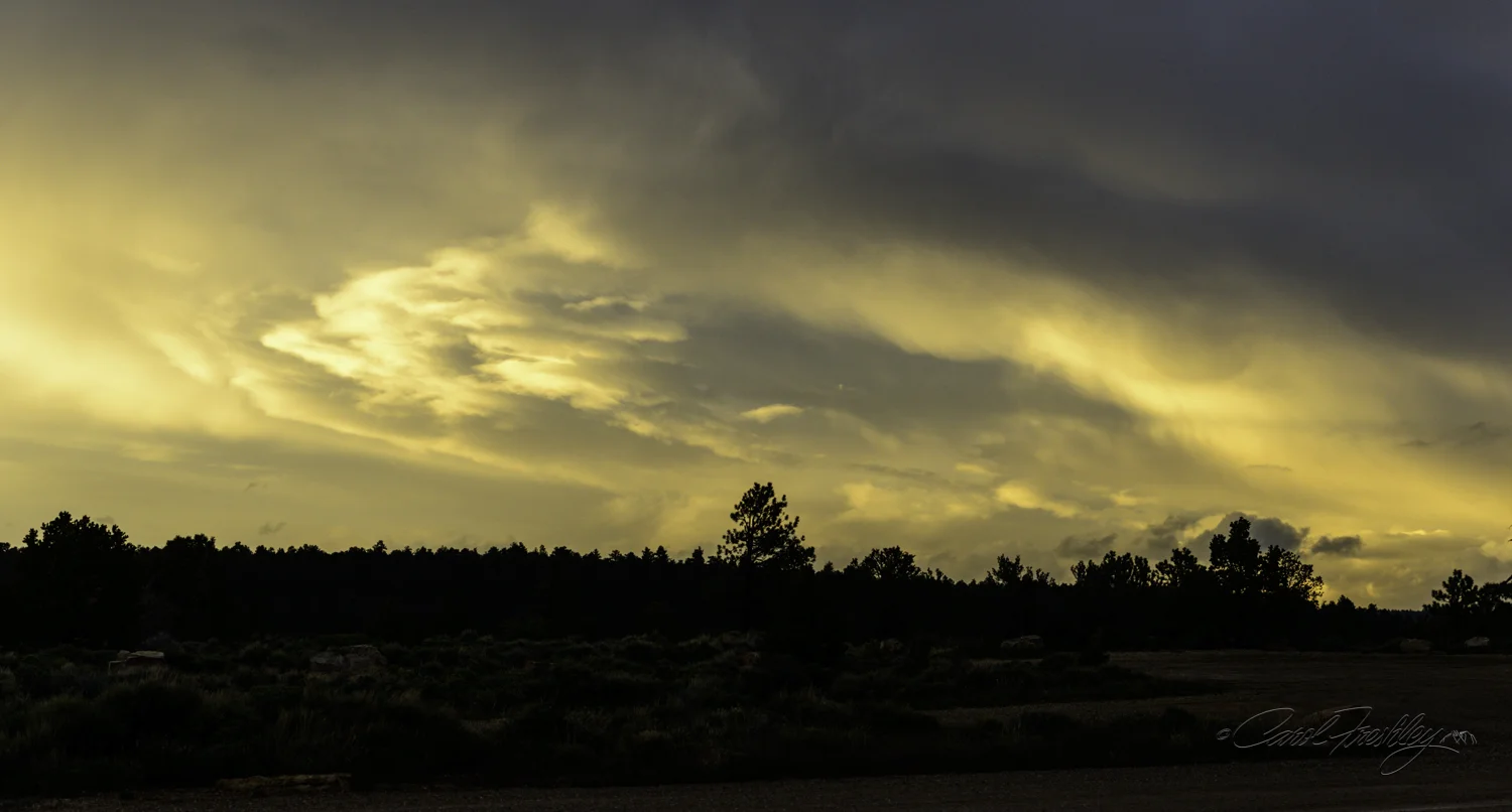 It is easier to be wise and practical when one takes turns passing the optimism baton back and forth! We decided to head up to the North Rim, spend the night camped out and take a look at photo opportunities out on Cape Royale. Dave knows that area very well, had a site in mind where I could park my Miss Precious Prissy Prius. We planned to set up camp first so that we would not have to do it in the dark. As it turned out, it was a wise decision as we returned well after dark and in rain. The whole drive was punctuated by fog, heavy dark clouds, moments of clearing, and snow.