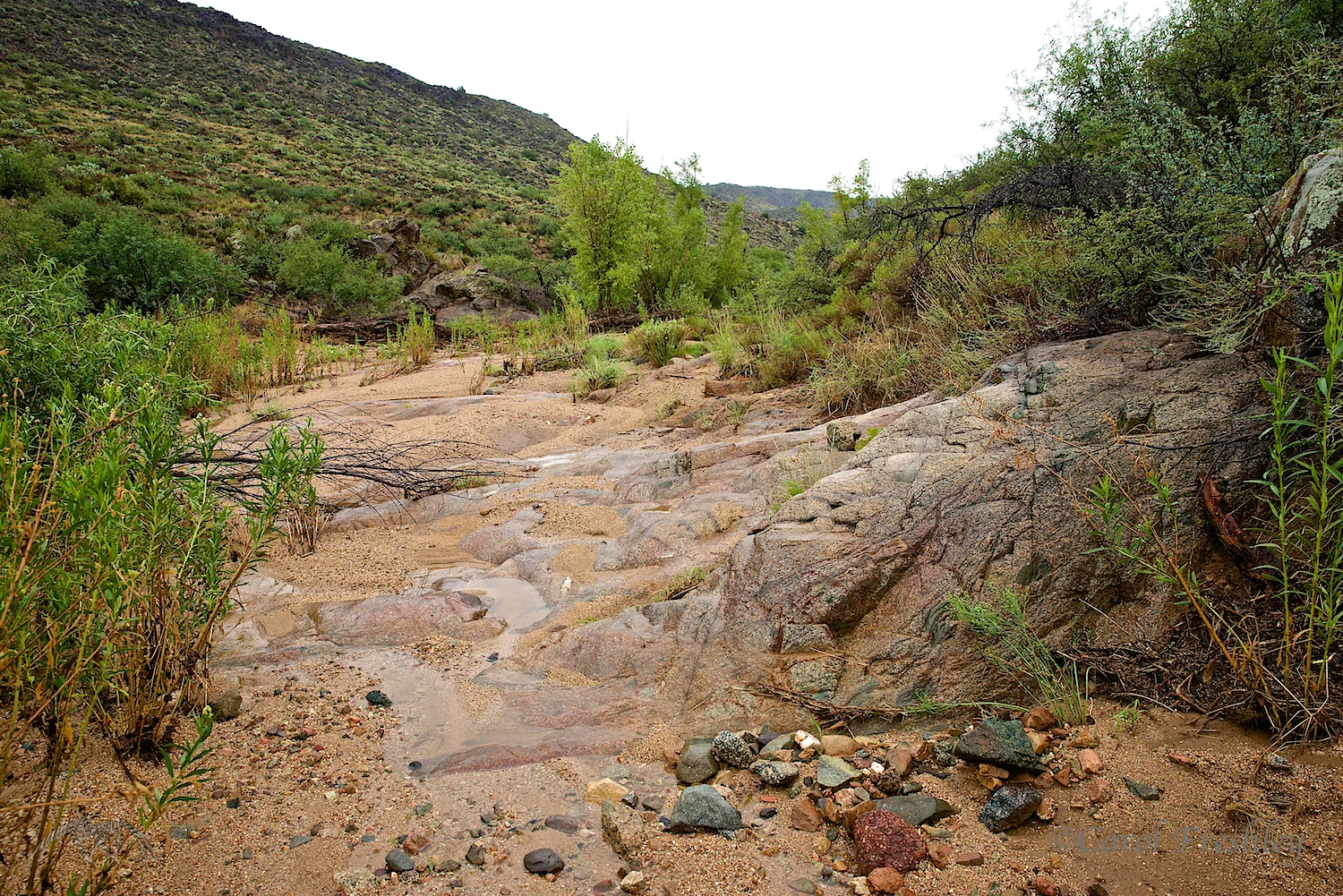 The wash runs between two hills. During monsoon season there is a real risk of flash flooding through the wash. In one places a hiker may see debris caught up to 30 feet on the hillsides, evidence of a recent flash flood.