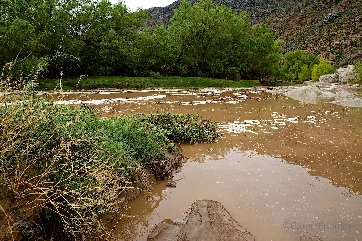 A number of friends have hiked Badger Springs Wash with me.  It is an easy and popular hike, pretty flat and cooler down in the canyon than up at the ridge.  The variety of birds, plants and rocks make it interesting every time you go.  I have always wanted to hike it after a good soaking rain.  Common sense would suggest that the water going over the rocks would make for interesting photography!!  So, yesterday I decided the day had arrived for hiking the wash!  Drum roll please!!  LOL  All shot with Nikon D800, Tamron 24-70mm lens and NO tripod.  I went with one camera/lens and an umbrella.