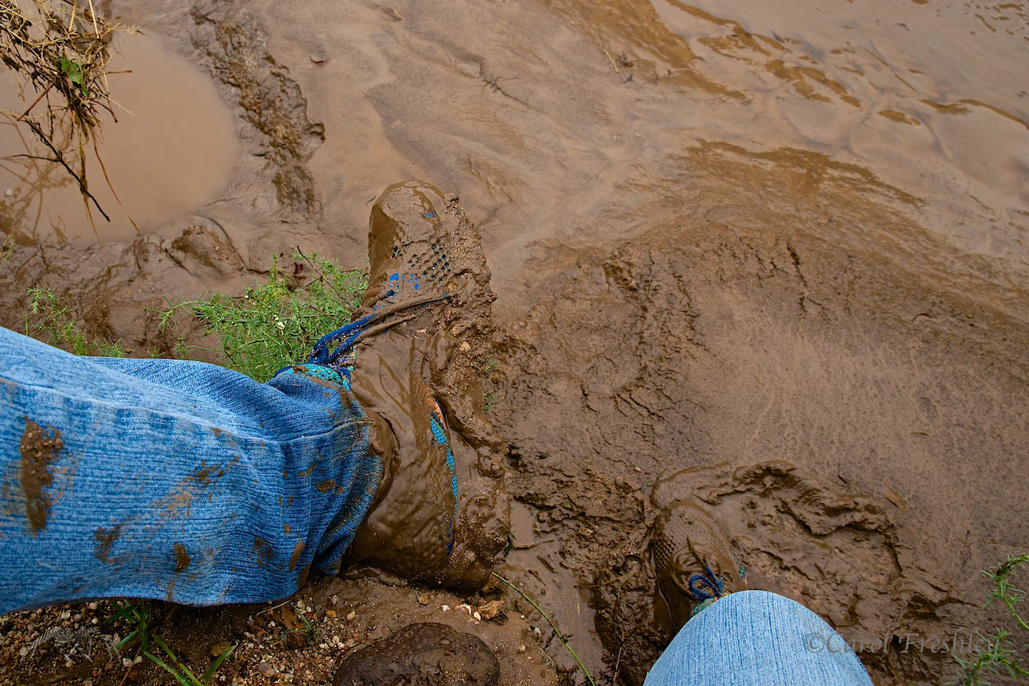 I stayed on the banks for a while.  I was resting and trying to rinse out my shoes in the muddy water. I did take some video on my phone but for whatever reason I never thought of taking any video on my camera.  The quality would have been so much better out of my camera and the resulting iPhone video just does not cut it!!  As I headed back I was grateful to have had the opportunity to witness how nature destroys while renewing.  My relatively clean shoes lasted just five minutes!  It had stopped sprinkling, the sun was peeking through in places.  Life is very good.