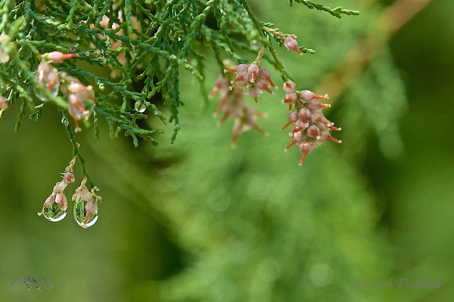 Have never seen the flowers before.  These are usually brown and brittle . . . Wow!  I had no idea how gorgeous these teeny tiny blossoms are, now covered with water droplets.