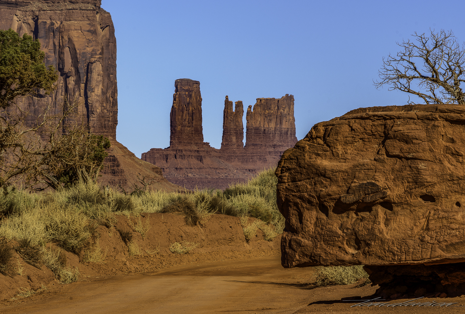 Monument Valley is known for towering sandstone buttes that are testimony to the erosion of winds and water. The Valley is most easily accessed by the looping 17 mile Valley Drive that is open to the public. If you are serious about photographing more of the Valley we recommend hiring a guide. There is a good reason for having a guide, other than it is required to go off Valley Drive. There are no marked or paved roads. l We hired two guided trips, one being a Sunrise Tour and the other an overnight campout on Hunt’s Mesa. The latter is covered in a separate blog posting.
